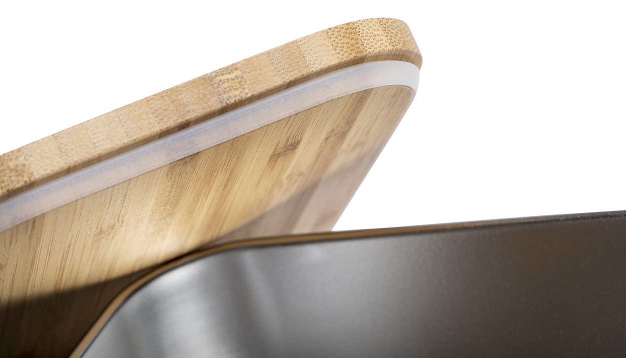 Pudełko na lunch ze stali nierdzewnej z pokrywką z naturalnego bambusa. Ze sztućcami (nóż i widelec) oraz elastycznym paskiem. 600 ml.