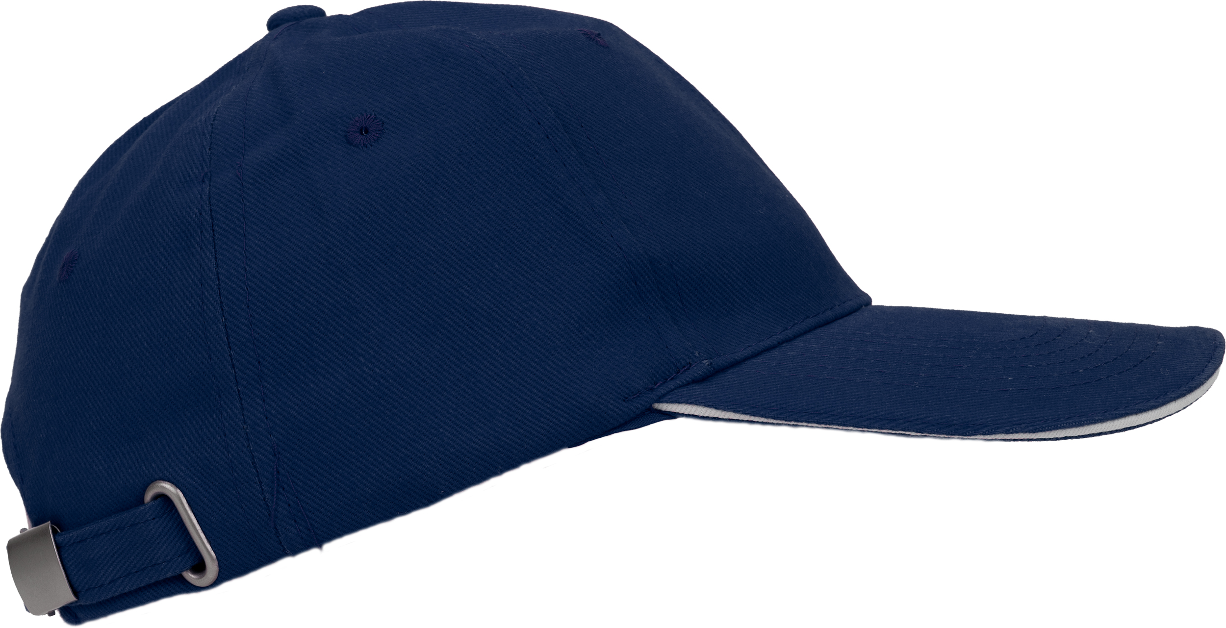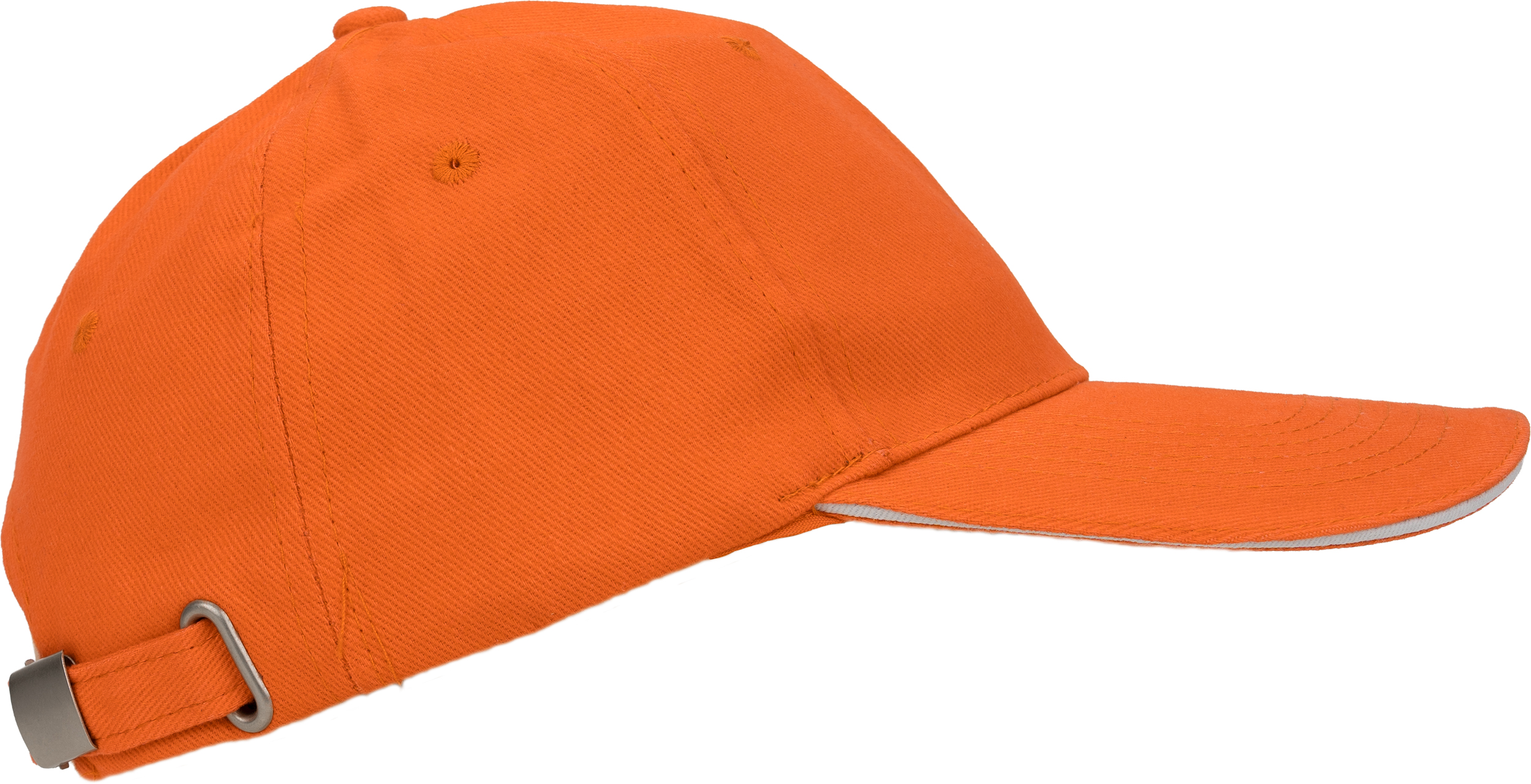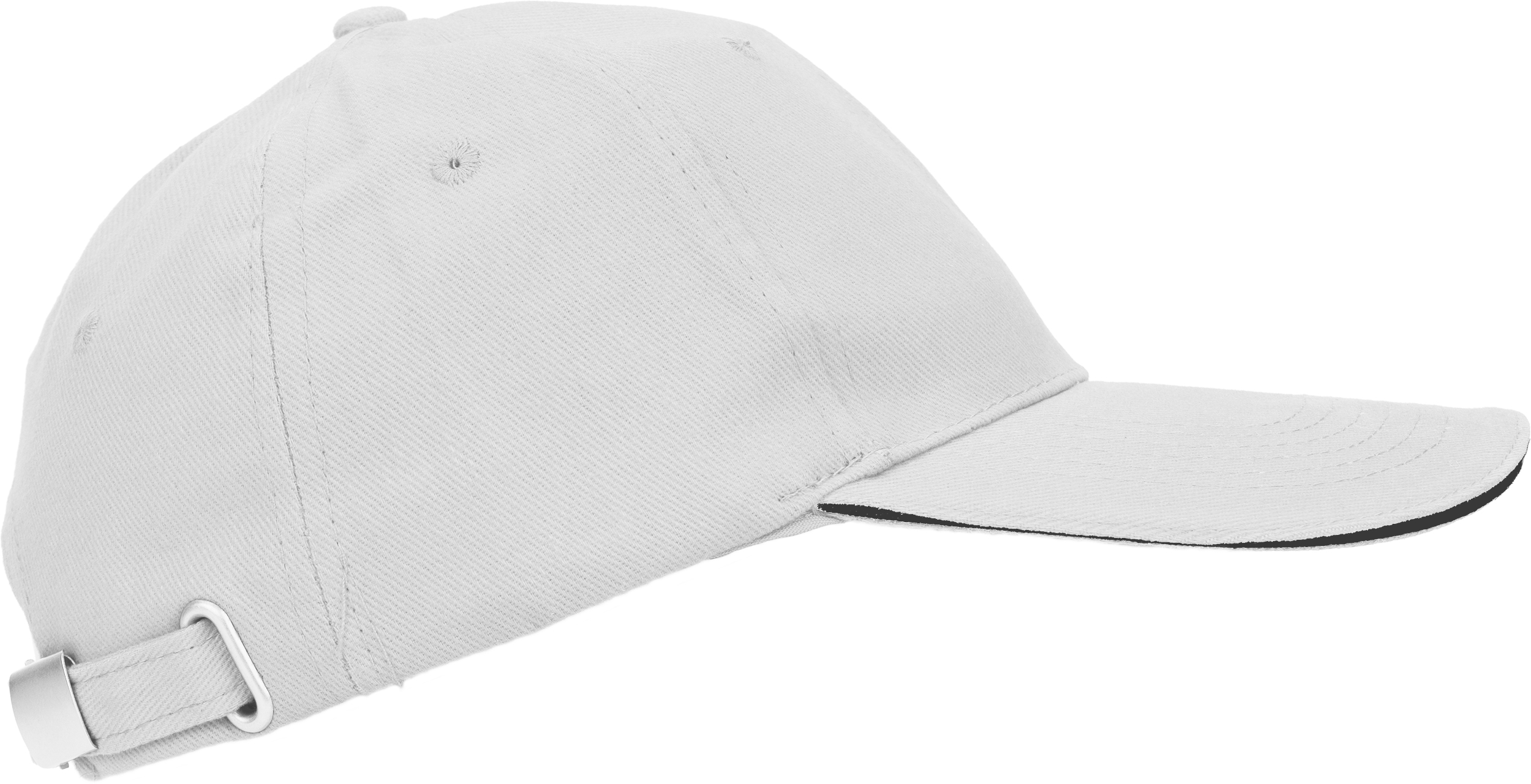 Bawełniana, 6-panelowa czapka z daszkiem typu Sandwich, wykonana z bawełny czesanej wolnej od AZO (gramatura 260 g/m²), regulowana za pomocą metalowego zapięcia.