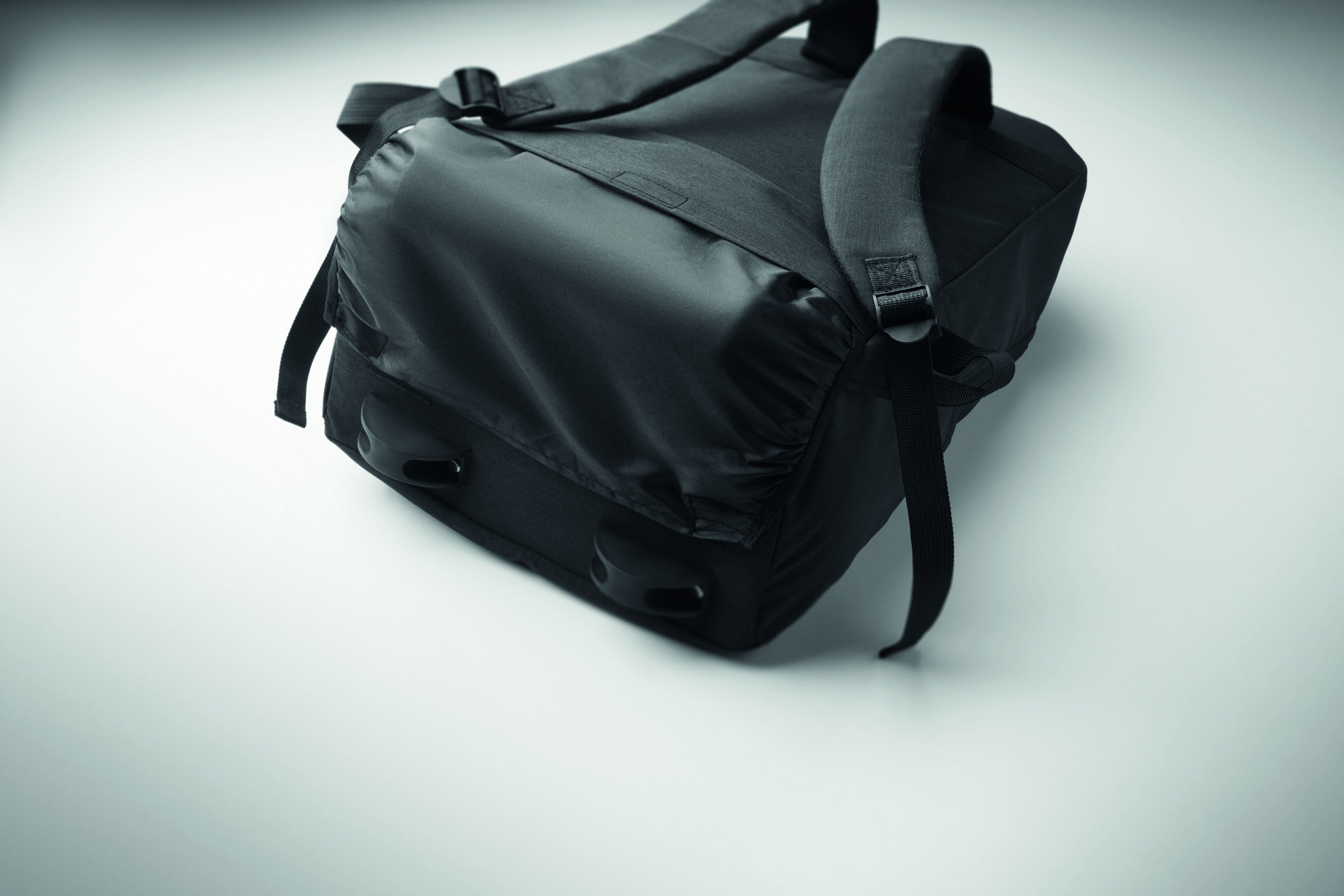 Plecak na laptopa na kółkach z poliestru 600D RPET. Zawiera jedną wewnętrzną przegrodę na laptopa 15 cali. Przednia kieszeń zapinana na zamek. Dwie boczne kieszenie wsuwane. Trzy wewnętrzne kieszenie wsuwane. Wyściełane plecy i szelki. 2 kółka i podwójna rama.