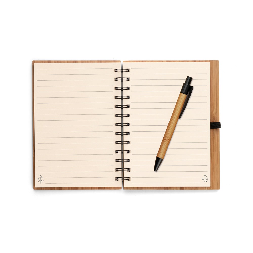 Notes A5 na spirali, w twardej bambusowej oprawie. Posiada 140 stron w linie w kolorze kości słoniowej (70/m²) z papieru z 100% recyklingu i uchwyt na długopis (w zestawie dołączony długopis). Bambusowy długopis z niebieskim napisem. Ponieważ produkt jest wykonany z naturalnych materiałów, kolor produktu oraz wynik drukowania mogą się różnić w zależności od produktu