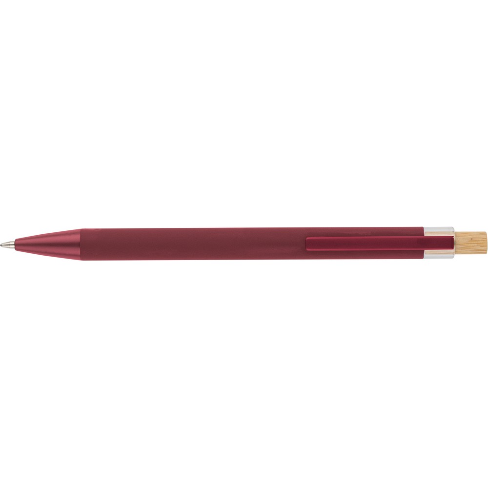 Długopis, bambusowy przycisk, metalowy klips, wkład w niebieskim kolorze, ikona recyklingu na produkcie, wystarcza na ok. 800 m pisania, produkt wykonany z ABS z recyklingu, aluminium i bambusa