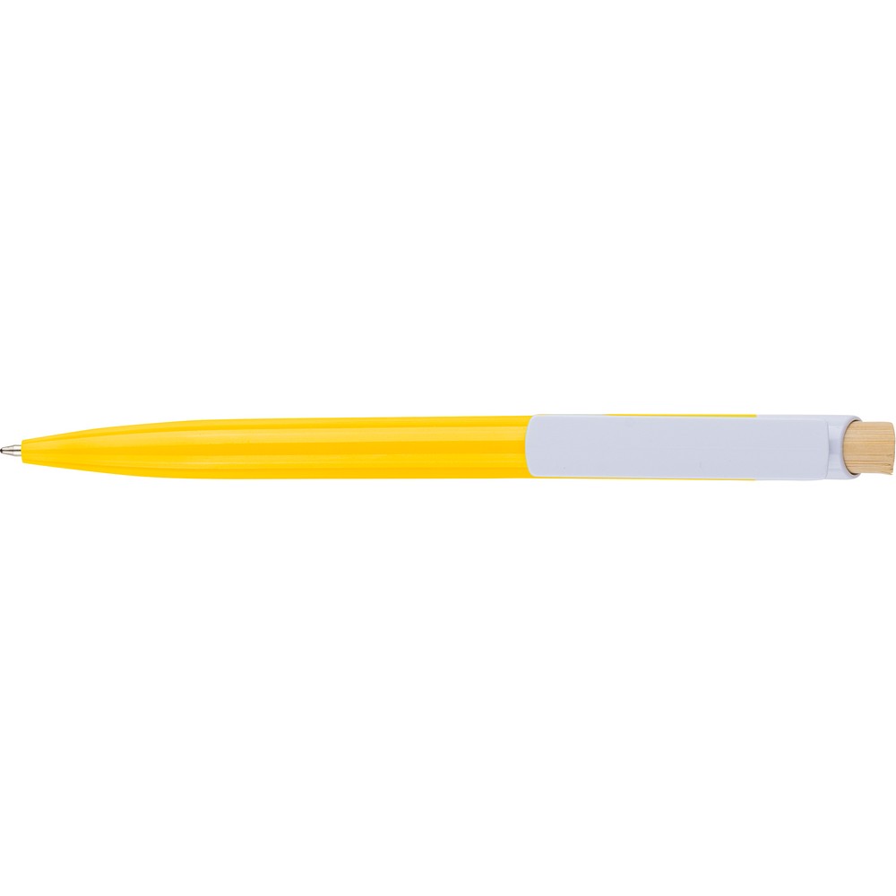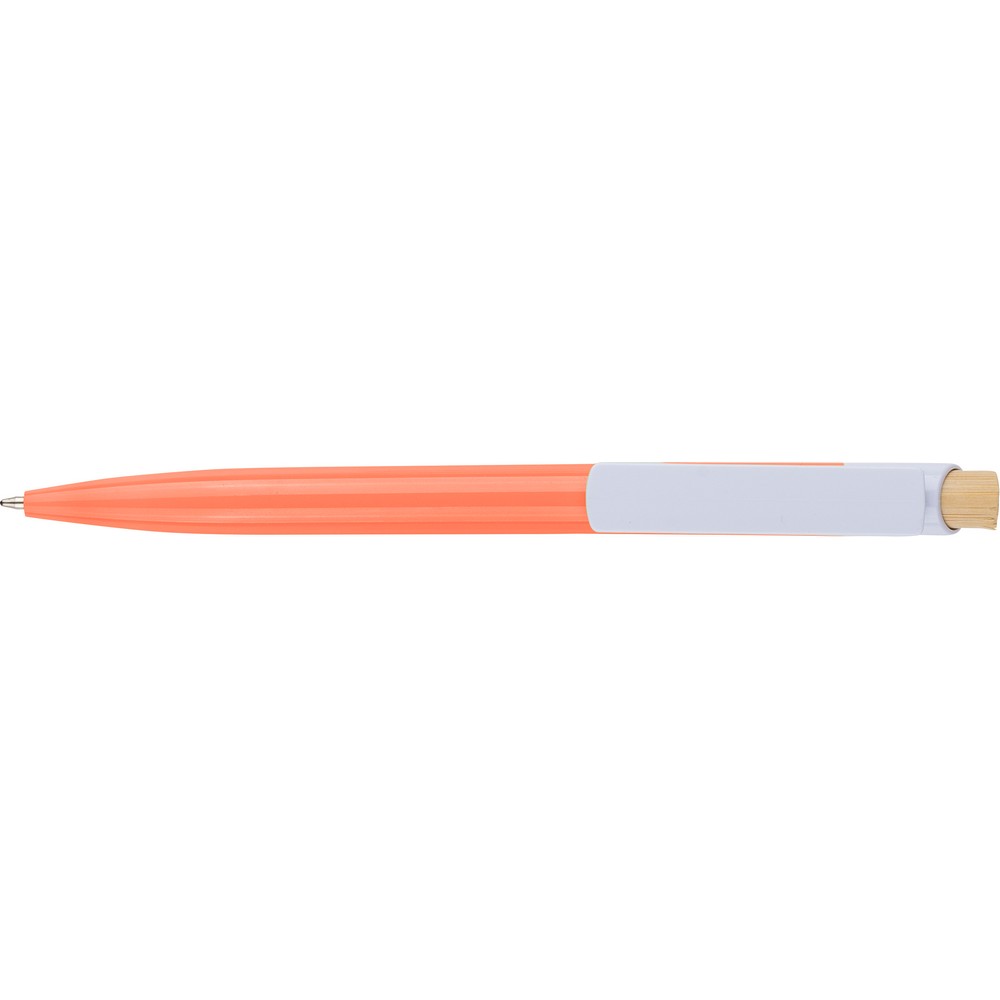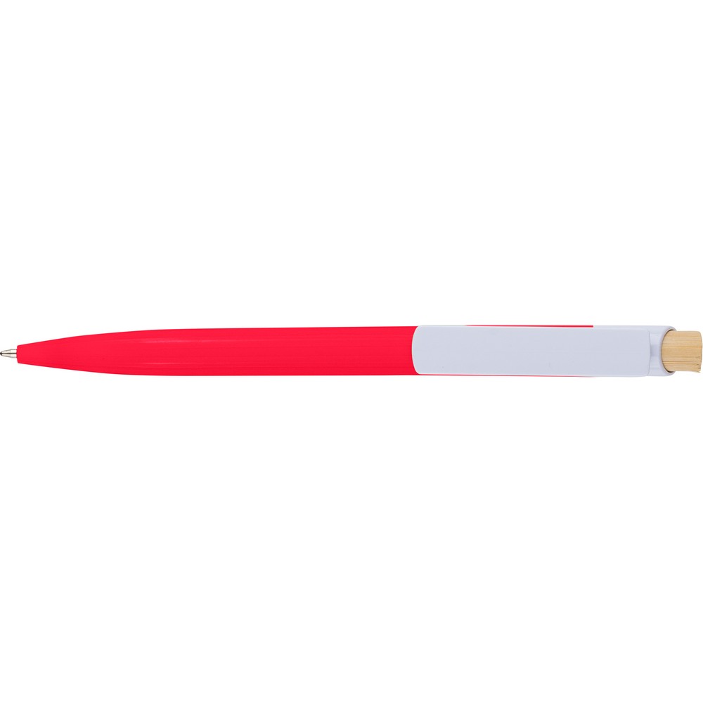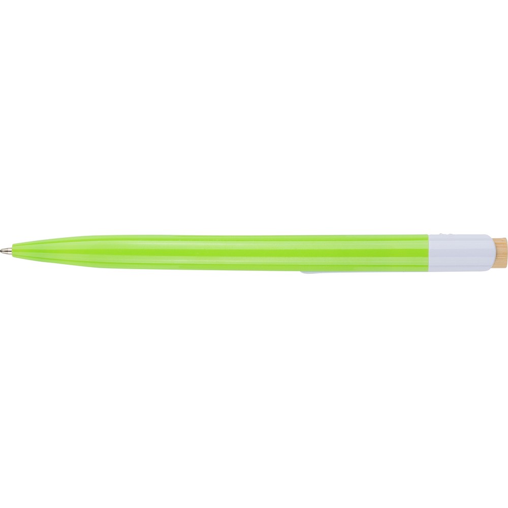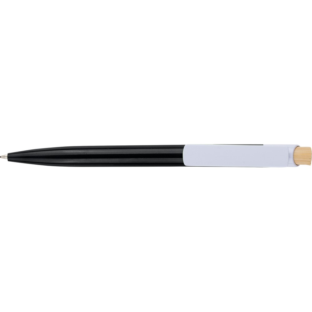 Długopis, bambusowy przycisk, metalowy klips, wkład w niebieskim kolorze, ikona recyklingu na produkcie, wystarcza na ok. 600 m pisania, produkt wykonany z ABS z recyklingu, aluminium i bambusa
