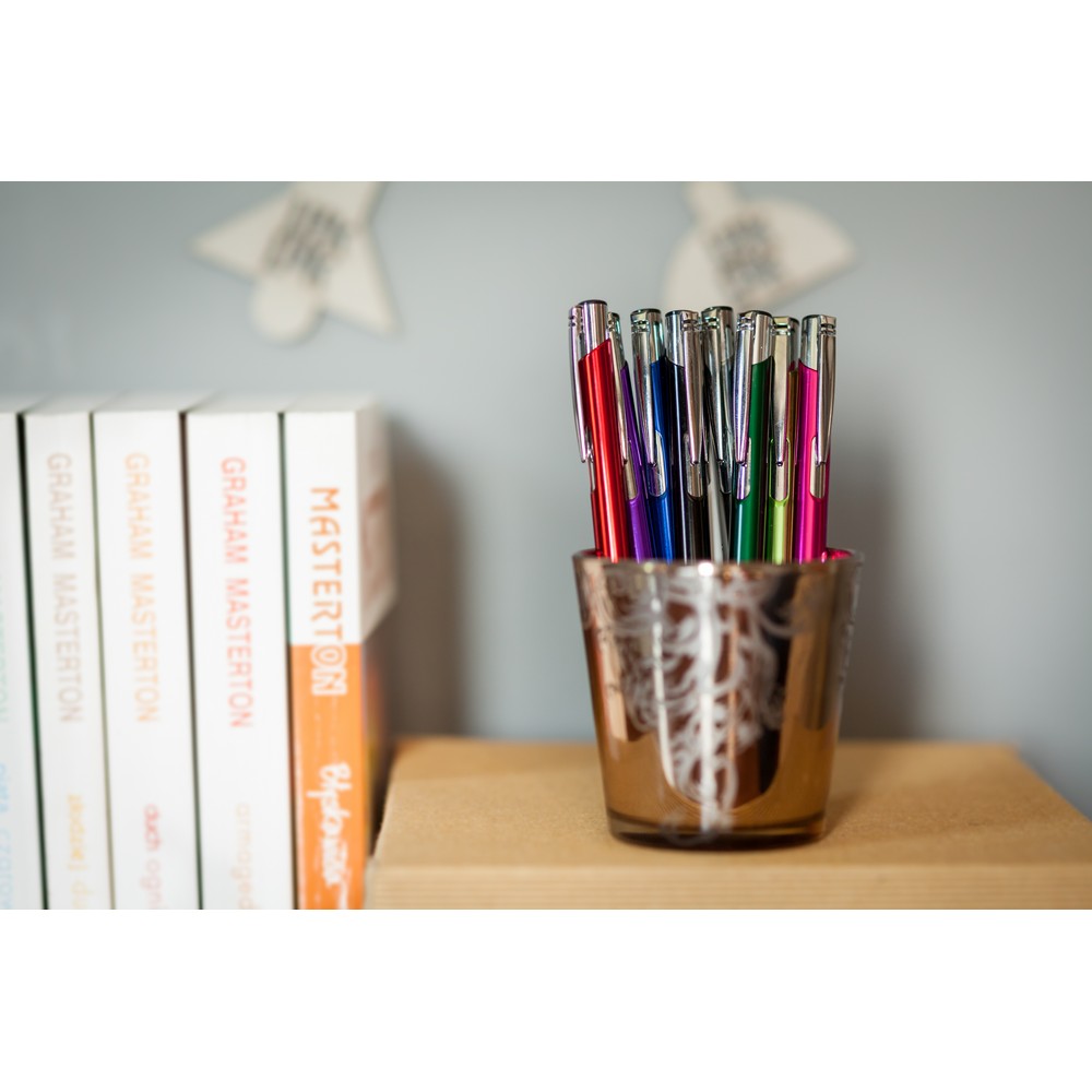 Długopis z kolorowym trzonem o błyszczącym wykończeniu, posiada elementy w srebrnym kolorze, wkład w niebieskim kolorze, produkt wykonany z aluminium