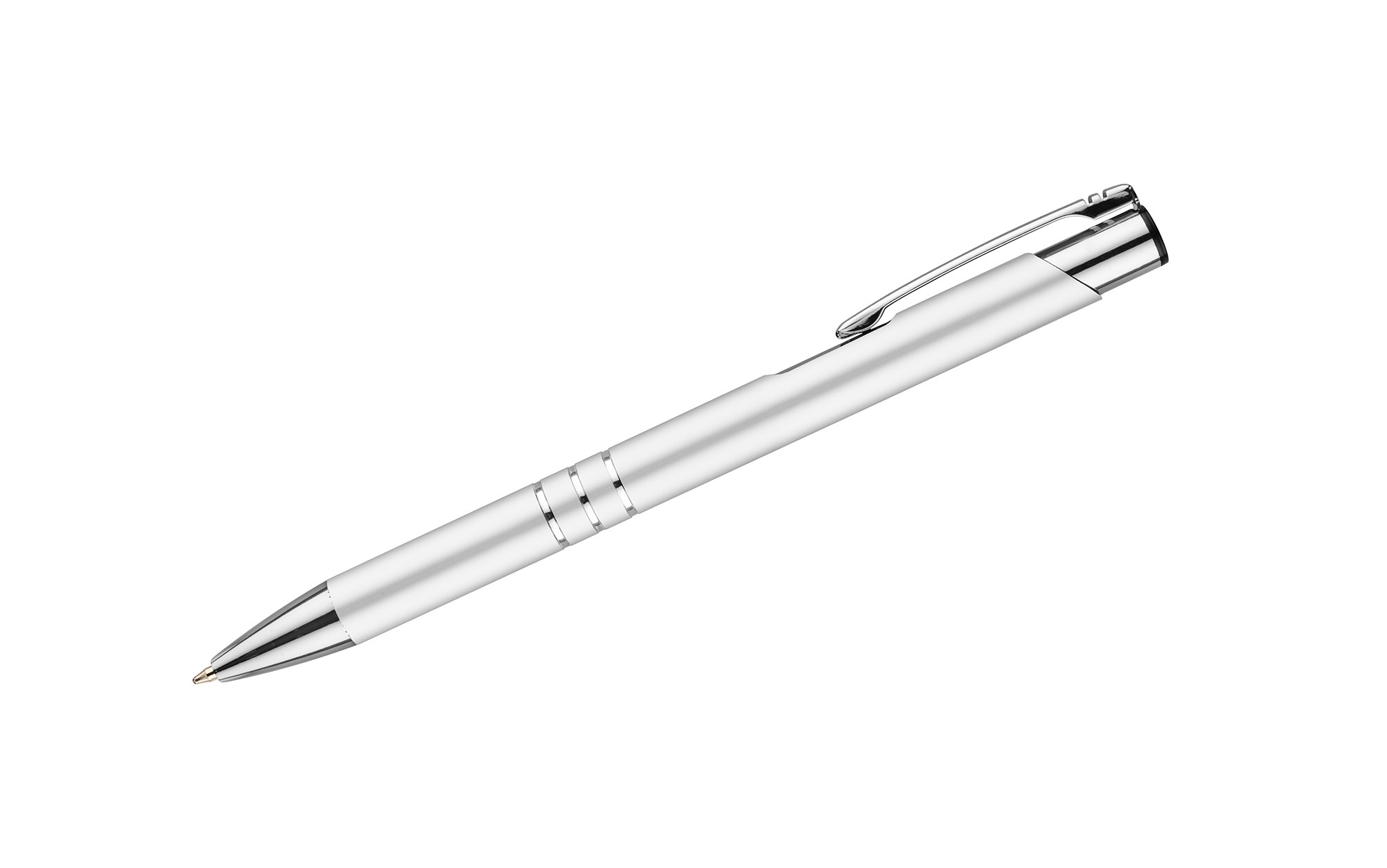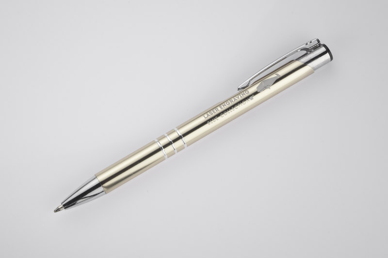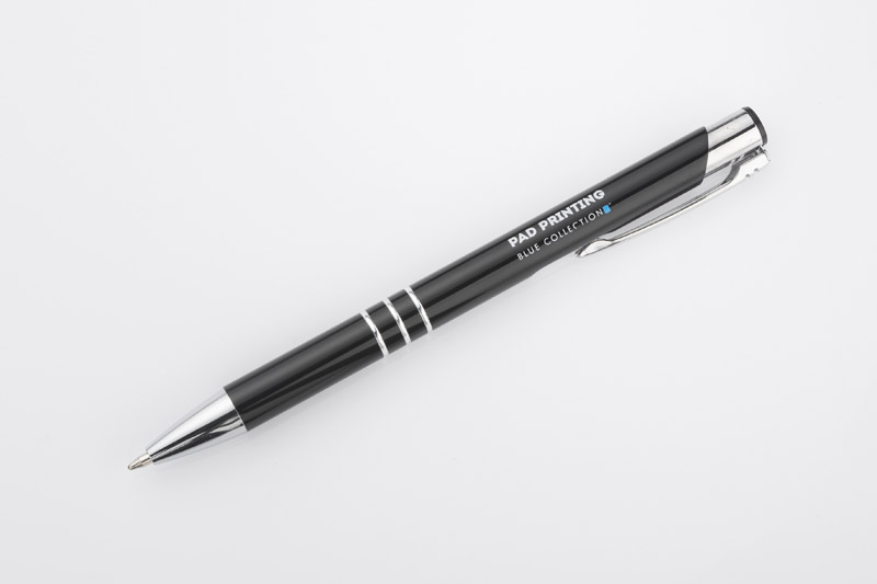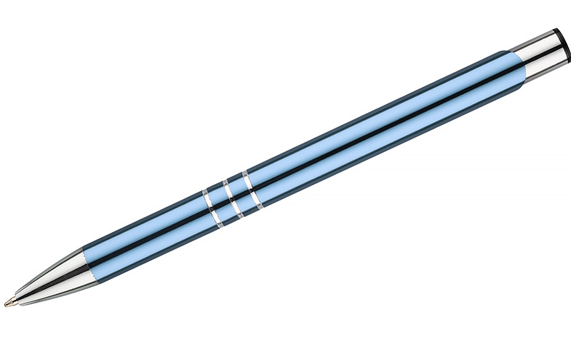 Metalowy długopis o metalizowanej chromowanej powierzchni. Długopis automatyczny z 3 ringami i niebieskim wkładem. Logo grawerujemy na powierzchni długopisu.