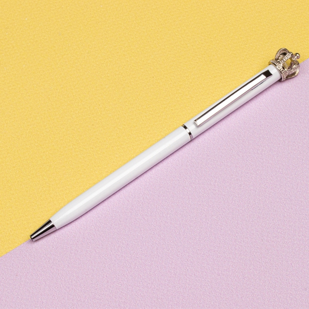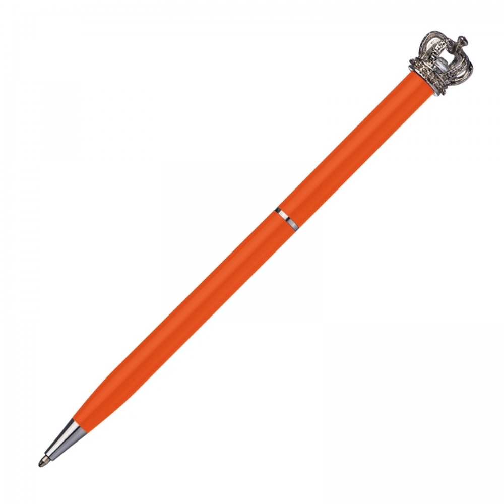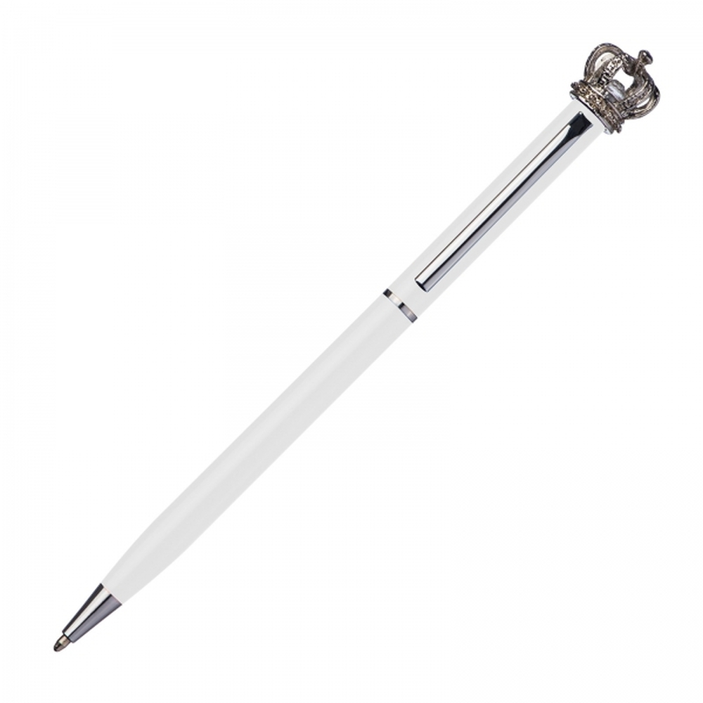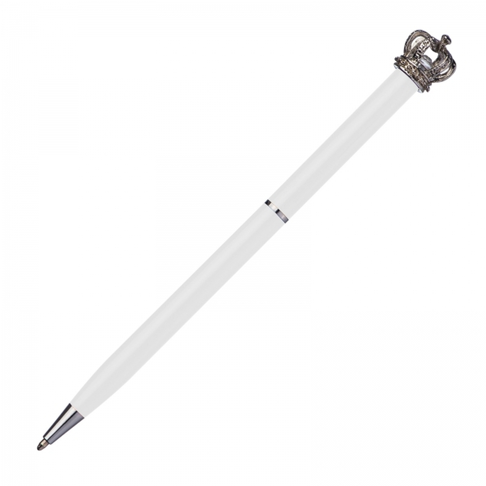Metalowy długopis z mechanizmem obrotowym, zakończony koroną i kryształkiem Swarovskiego. Wkład pisze na niebiesko.