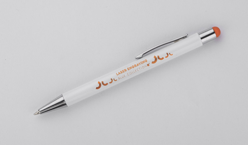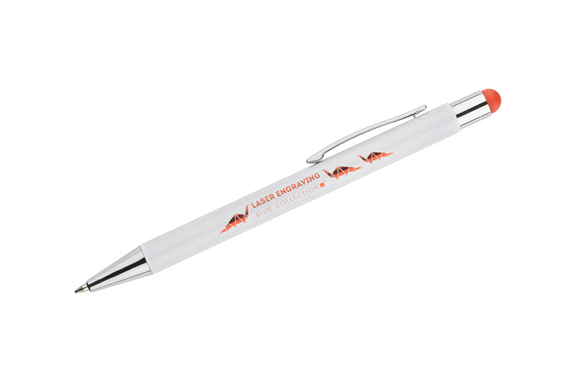 BIANCO to długopis, który zaskakuje efektem znakowania. Kolor grawera jest zbliżony do koloru końcówki touch do obsługi ekranów dotykowych. Korpus wykonany z aluminium pokrytego białą farbą. Długopis automatyczny. Wkład typu G2 w kolorze niebieskim.