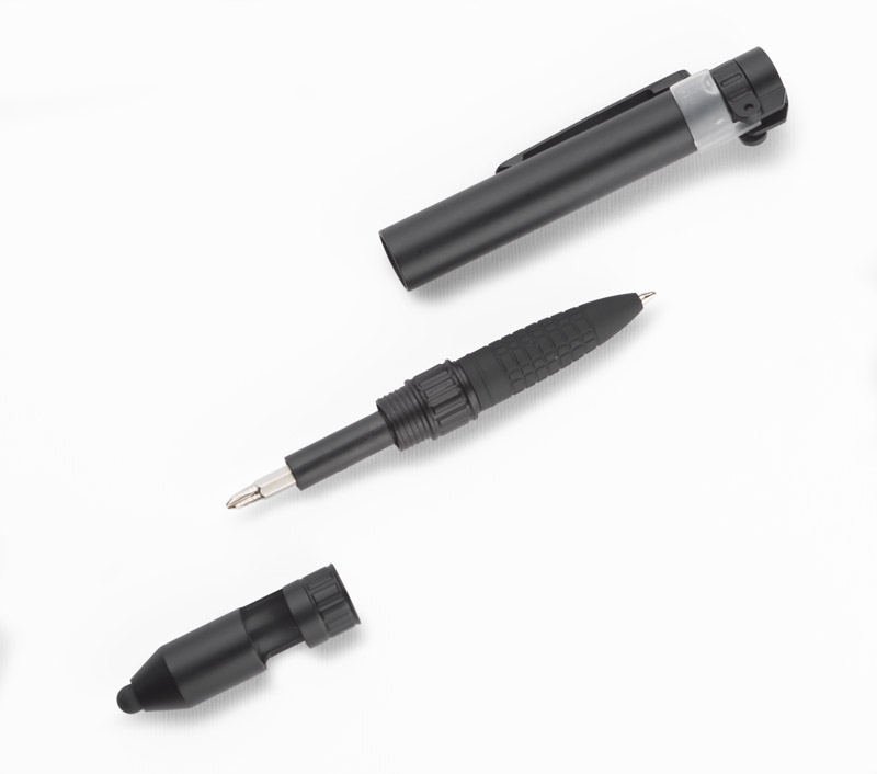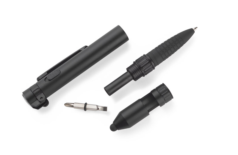 GYVER będzie idealnym podarunkiem dla prawdziwych gadżeciarzy, którzy od upominków reklamowych oczekują zaskakujących funkcji. Ten niepozorny mały przedmiot posiada aż 7 funkcji: długopis, touch pen, stojak do telefonu, latarka, 2 śrubokręty, kompas. Wkład w kolorze niebieskim.