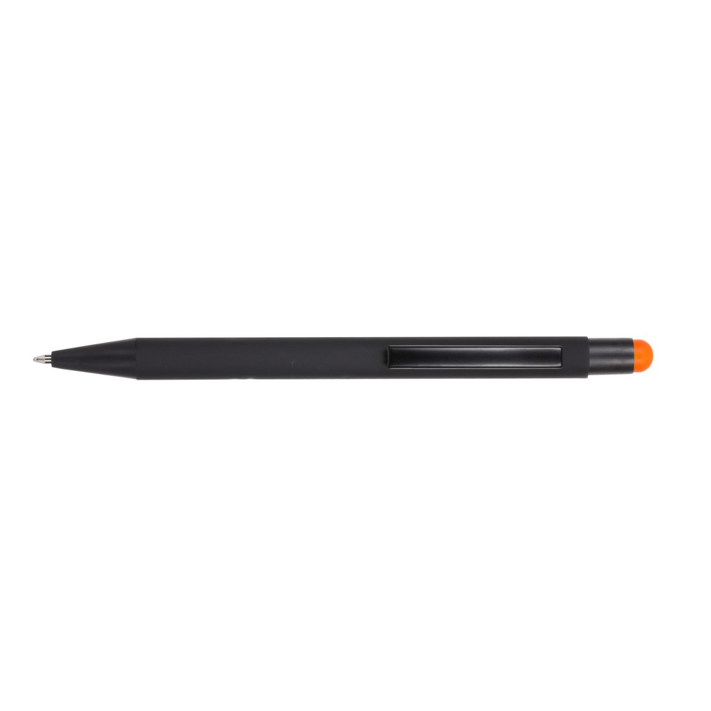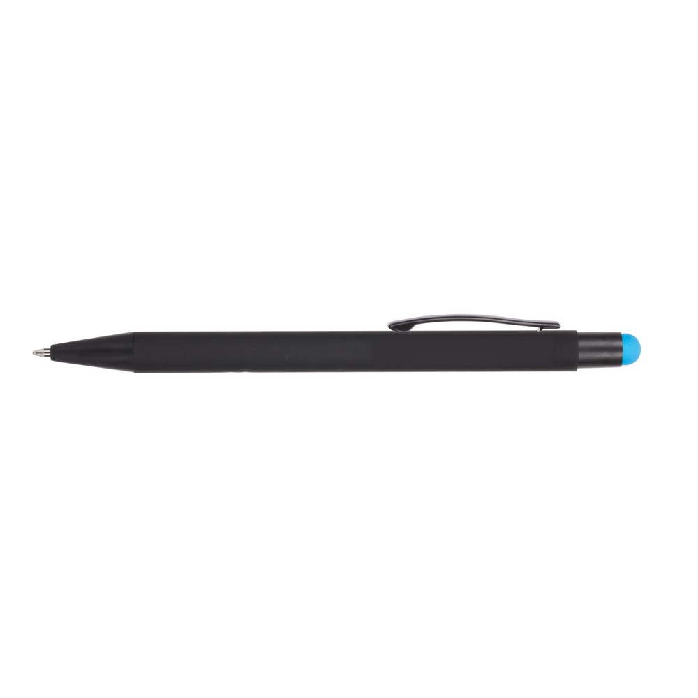 Długopis z czarnym trzonem, posiada gumowe wykończenie, kolorowa końcówka touch pen umożliwiająca obsługę ekranów dotykowych, grawer ukazuje powierzchnię w kolorze zbliżonym do koloru końcówki touch pen lub w kolorze białym, wkład w niebieskim kolorze, produkt wykonany z aluminium