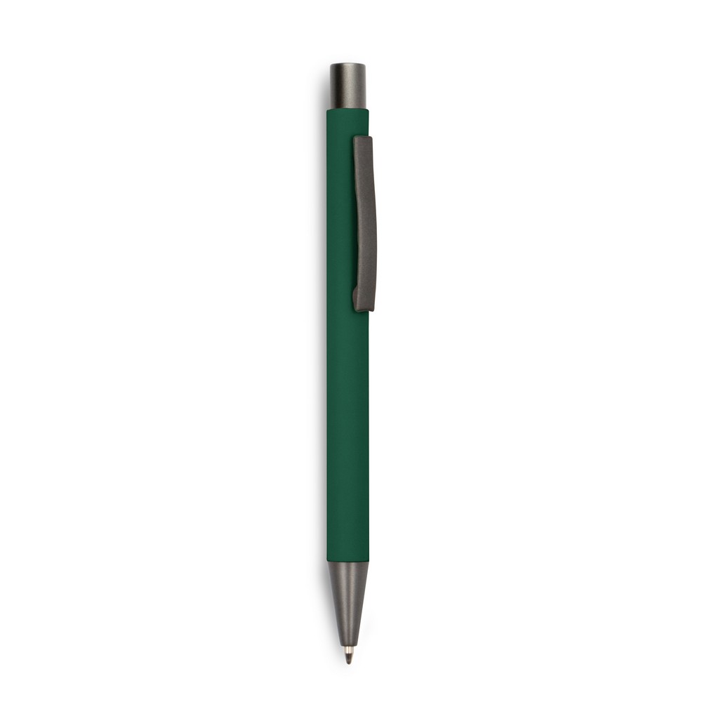 Długopis z kolorowym trzonem i szarymi elementami, posiada gumowe wykończenie, wkład w niebieskim kolorze, produkt wykonany z aluminium, plastiku i metalu