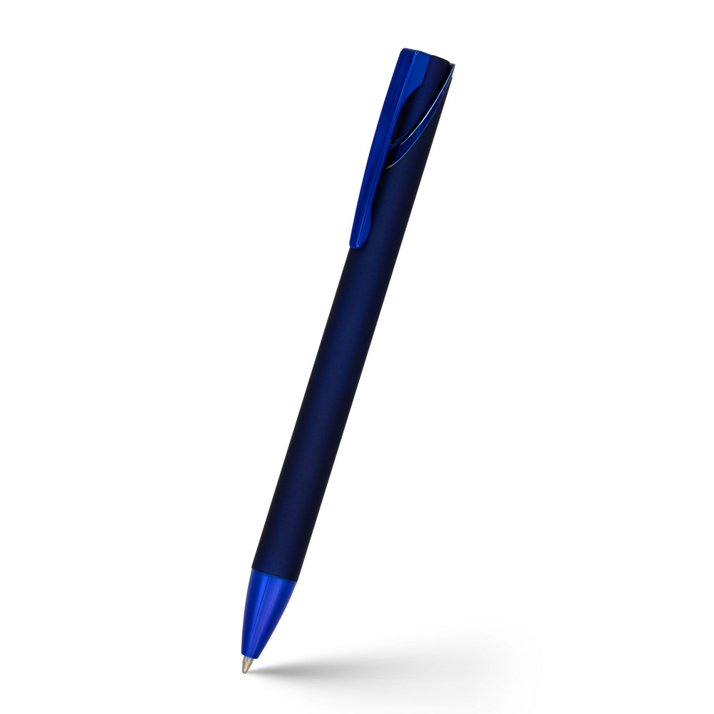 Długopis z kolorowym matowym trzonem i błyszczącymi elementami, wkład w niebieskim kolorze, czarne papierowe etui w komplecie, grawer ukazuje lustrzaną powierzchnię, produkt wykonany z metalu