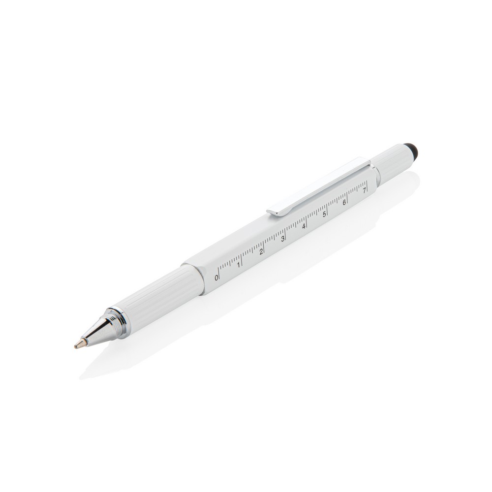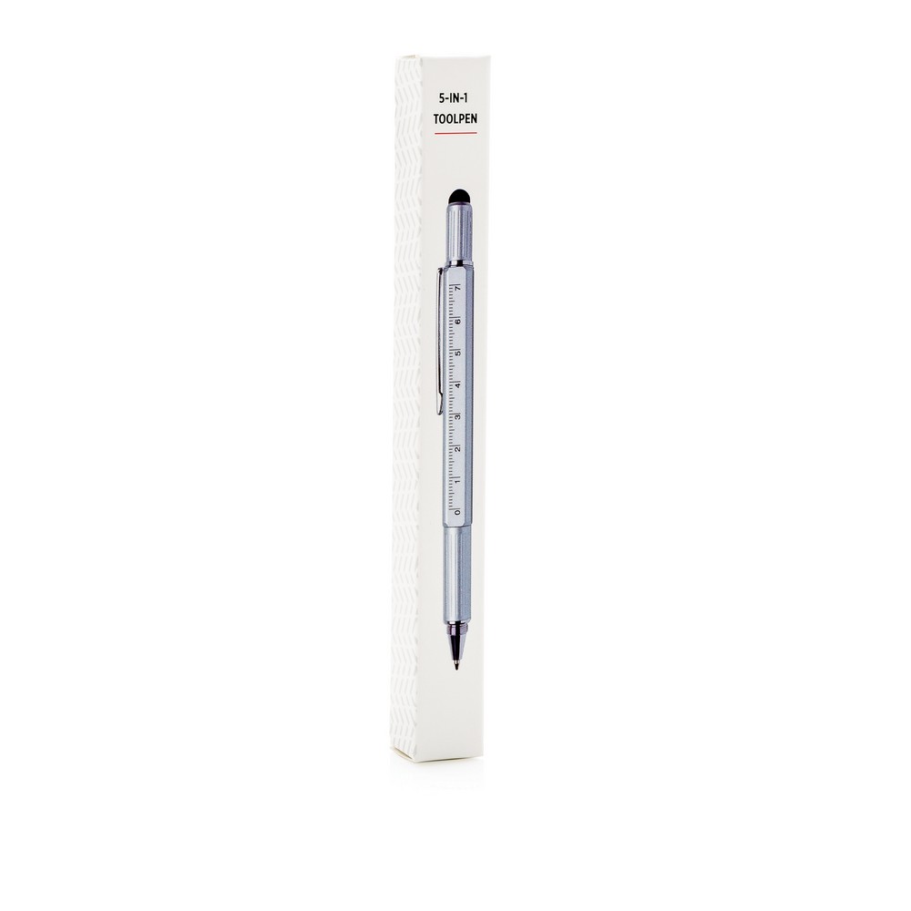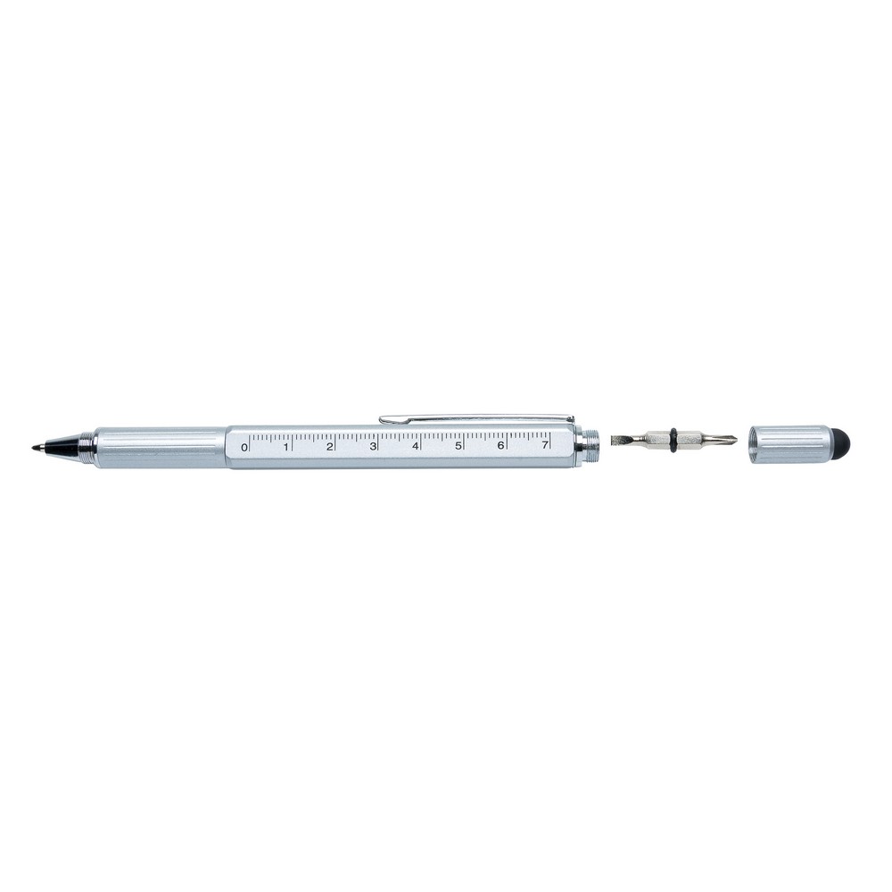Długopis wielofunkcyjny 5 w 1, linijka 7 cm, poziomica, śrubokręt, touch pen, wykonany z wysokiej jakości mosiądzu, aluminiowy klip, długość pisania do 400 m, ślad węglowy produktu: 0,21 kg CO2