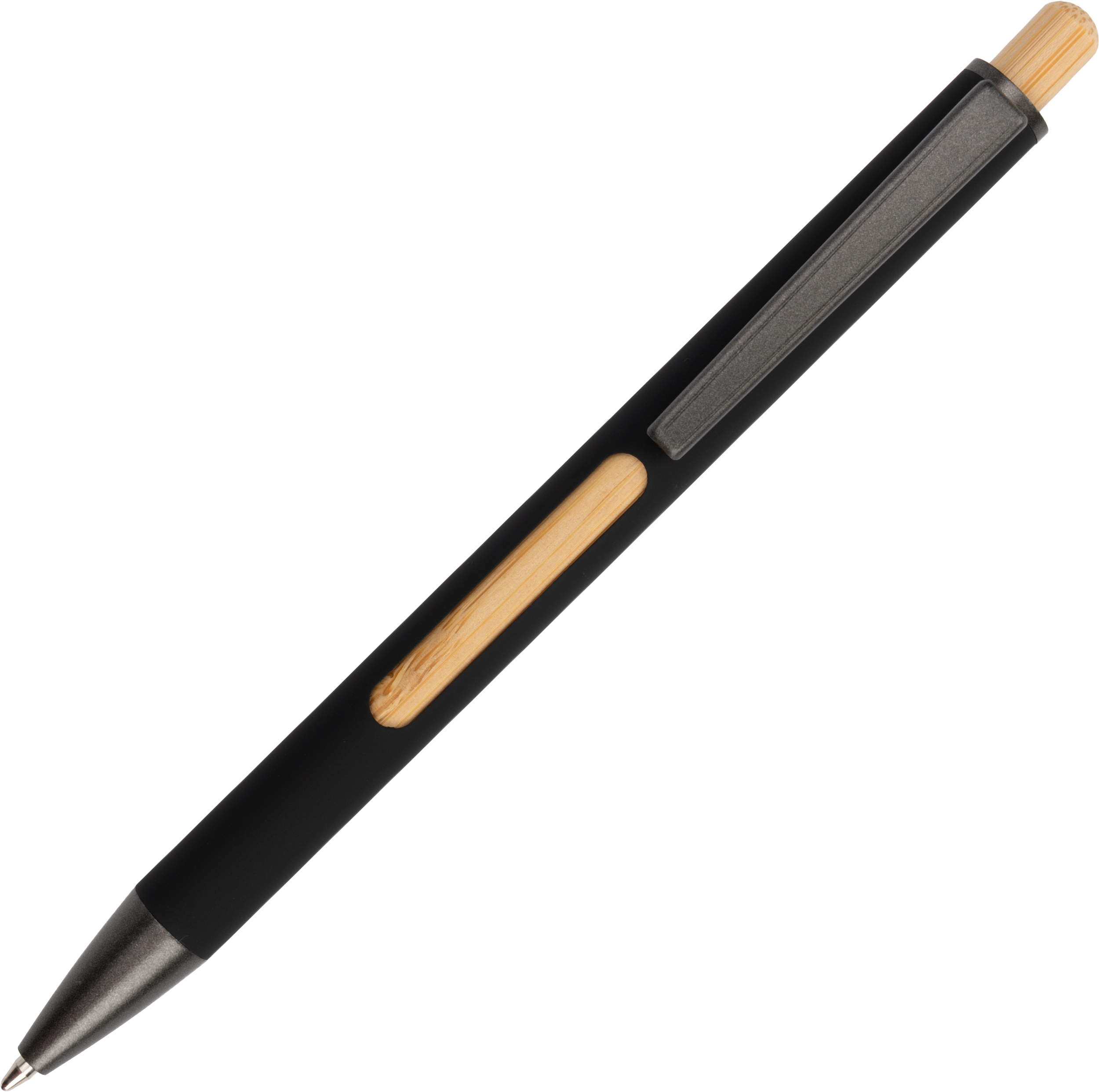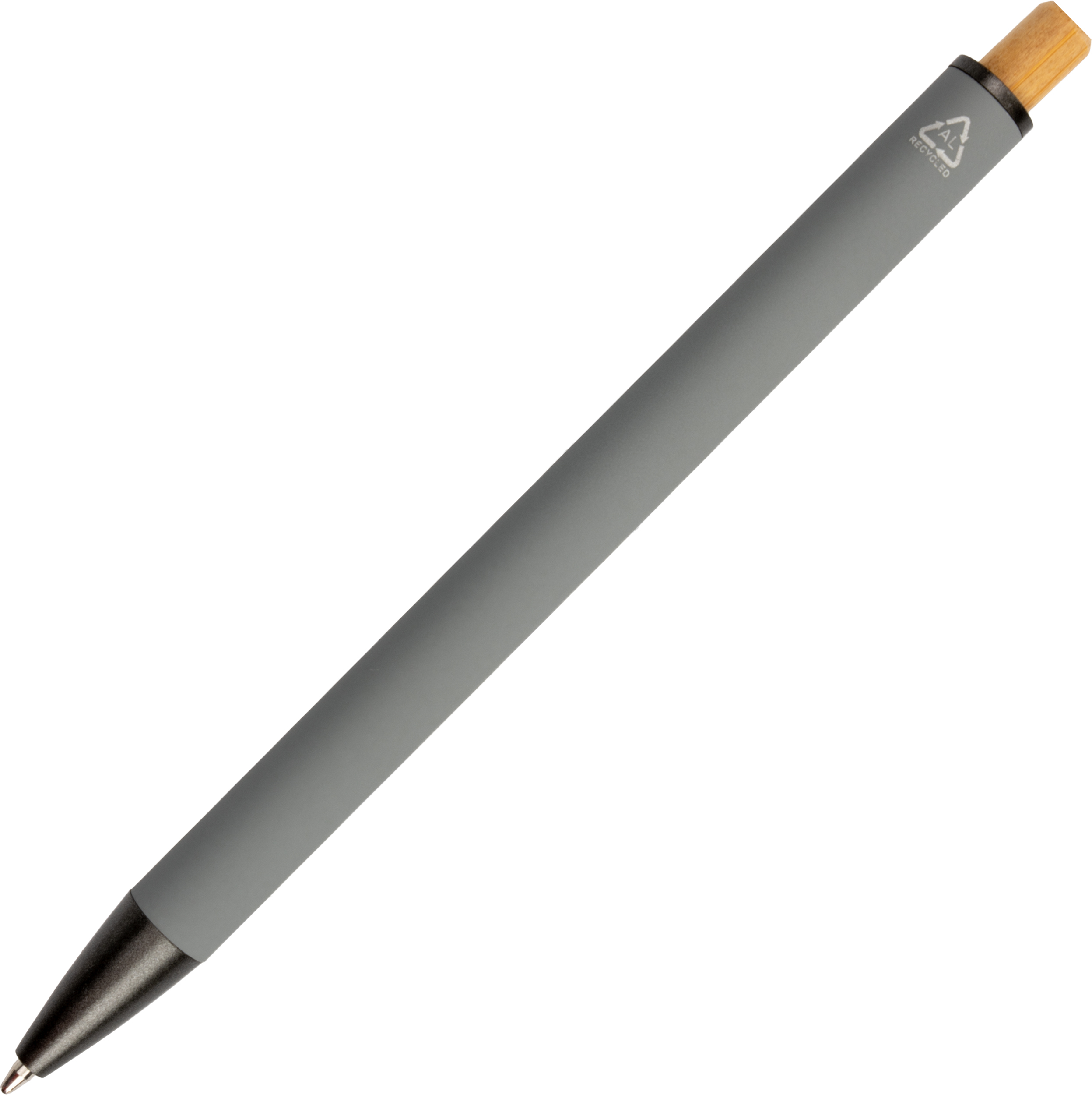 Długopis wykonany z aluminium z recyklingu, metalowym klipsem, bambusowymi akcentami i niebieskim wkładem.