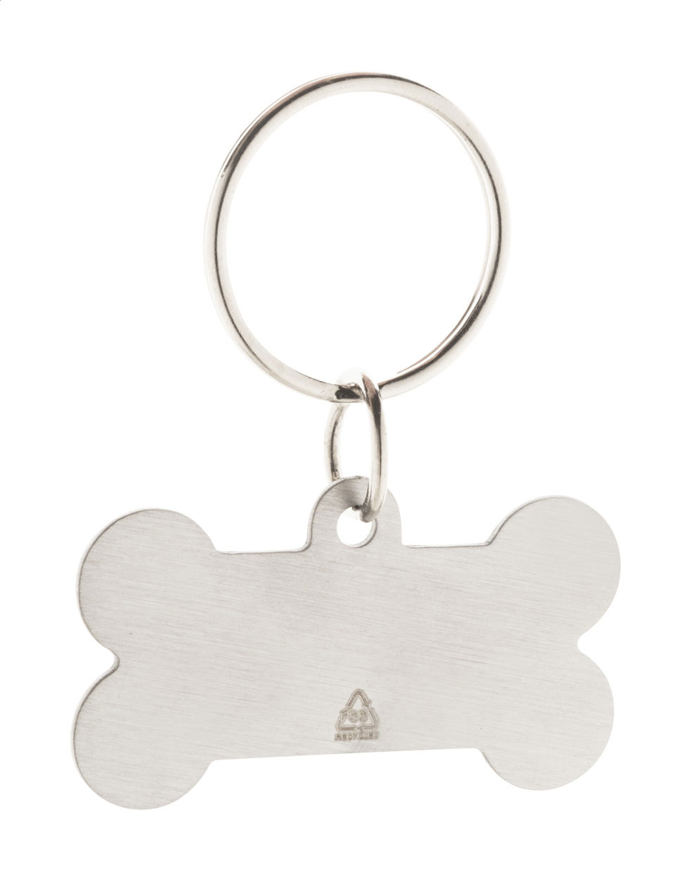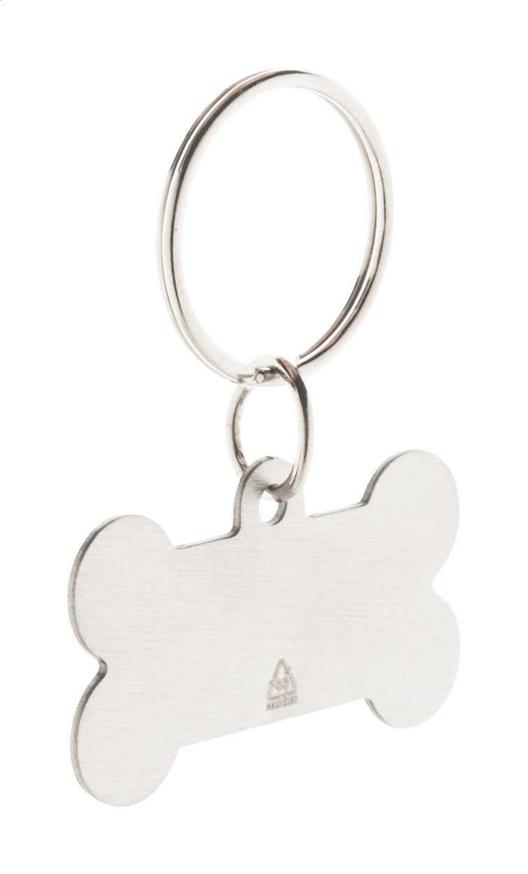 Przywieszka dla psa w kształcie kości, wykonana z recyklingowanej stali nierdzewnej, z brelokiem.