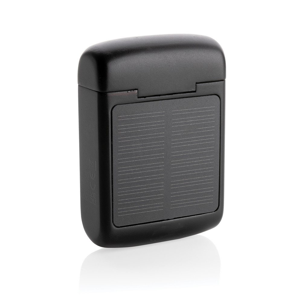 Słuchawki bezprzewodowe BT 5.3, zintegrowany panel słoneczny do ładowania słuchawek, prędkość ładowania solarnego 5V/0,05A, wbudowany mikrofon, funkcja odbierania połączeń, wykonane z ABS z recyklingu z certyfikatem RCS, całkowita zawartość materiałów z recyklingu obliczona w oparciu o wagę całkowitą przedmiotu: 19%, czas odtwarzania na średnim poziomie głośności do 5 godzin, zasięg do 10 m, kabel z TPE z recyklingu z certyfikatem RCS w komplecie, w pudełku z papieru kraftowego z certyfikatem FSC® mix, ślad węglowy produktu: 0,82 kg CO2