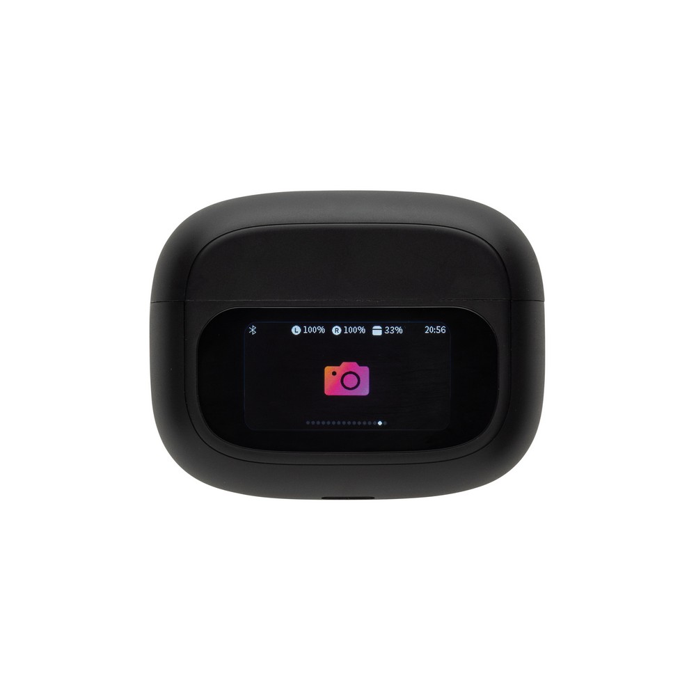 Bezprzewodowe słuchawki douszne z systemem aktywnej redukcji szumów (ANC), poziom redukcji szumów do 23 dB, BT 5.3, posiadają wbudowany ekran dotykowy TFT, który oferuje funkcje takie jak: przełączanie utworów, odbieranie połączeń, regulacja poziomu głośności i wiele innych, wodoodporne IPX4, wbudowany mikrofon, funkcja odbierania połączeń, do 6 godzin odtwarzania na jednym ładowaniu, ponowne naładowanie w etui ładującym w 1,5h, wykonane z ABS z recyklingu z certyfikatem RCS, w komplecie 3 pary nakładek w różnych rozmiarach, całkowita zawartość materiałów z recyklingu obliczona na podstawie wagi całkowitej przedmiotu: 43%, w pudełku z papieru kraftowego z certyfikatem FSC®
