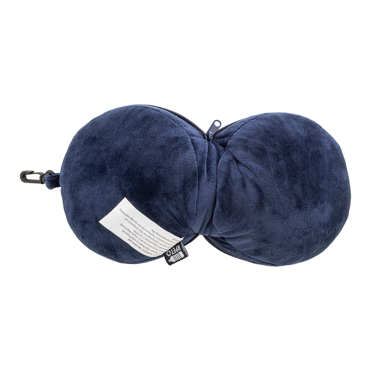 Poduszka podróżna z poliestru RPET ze zintegrowaną maską na oczy i elastycznymi paskami. Zapinana na suwak, tworzy kompaktową kulę, co ułatwia przechowywanie. W zestawie karabińczyk PP do przymocowania do bagażu. Z charakterystyczną etykietą RPET.