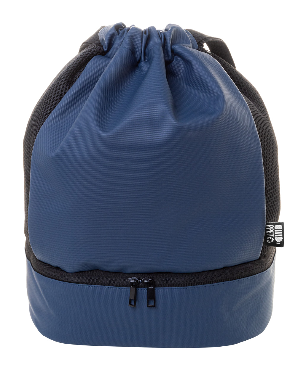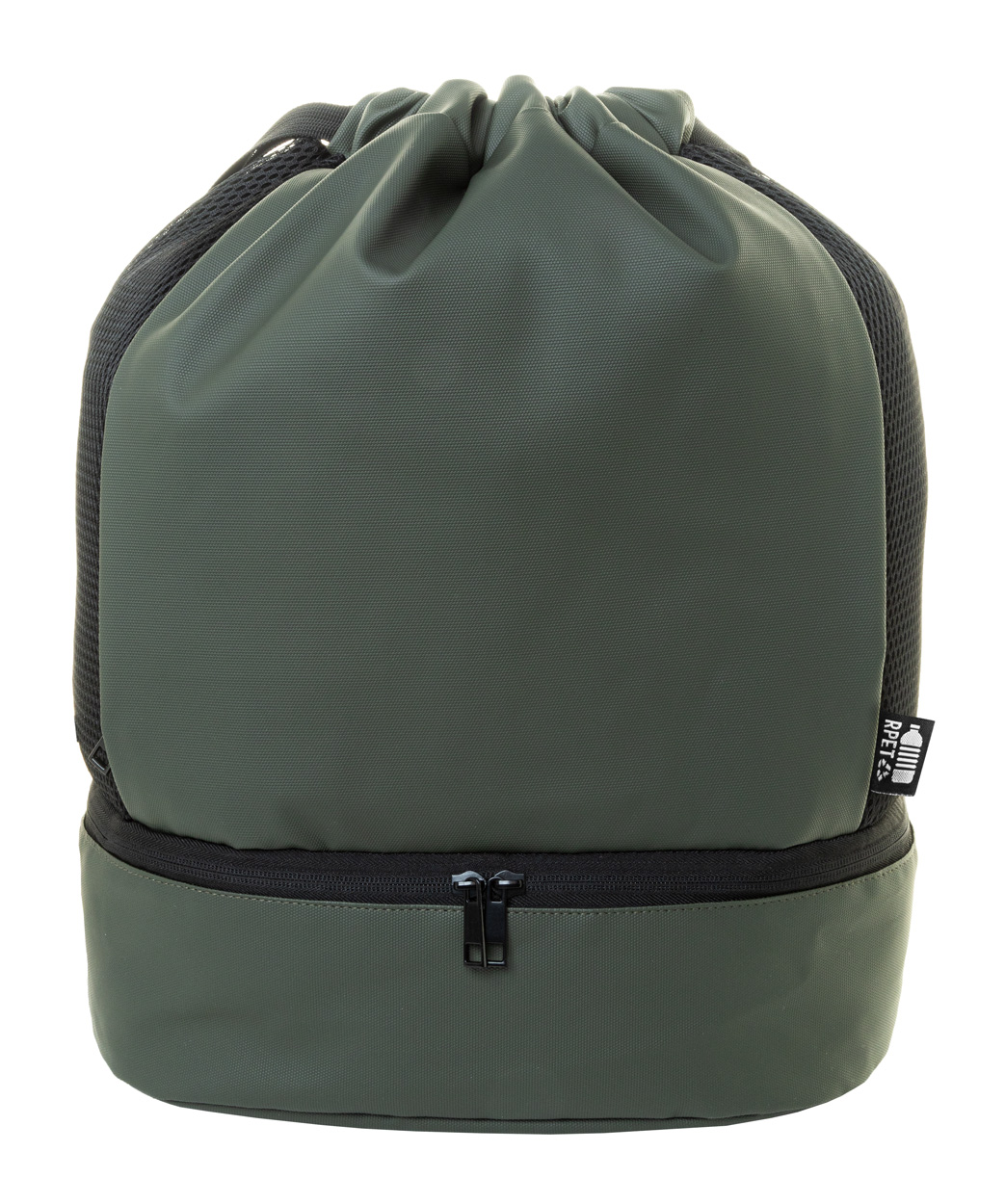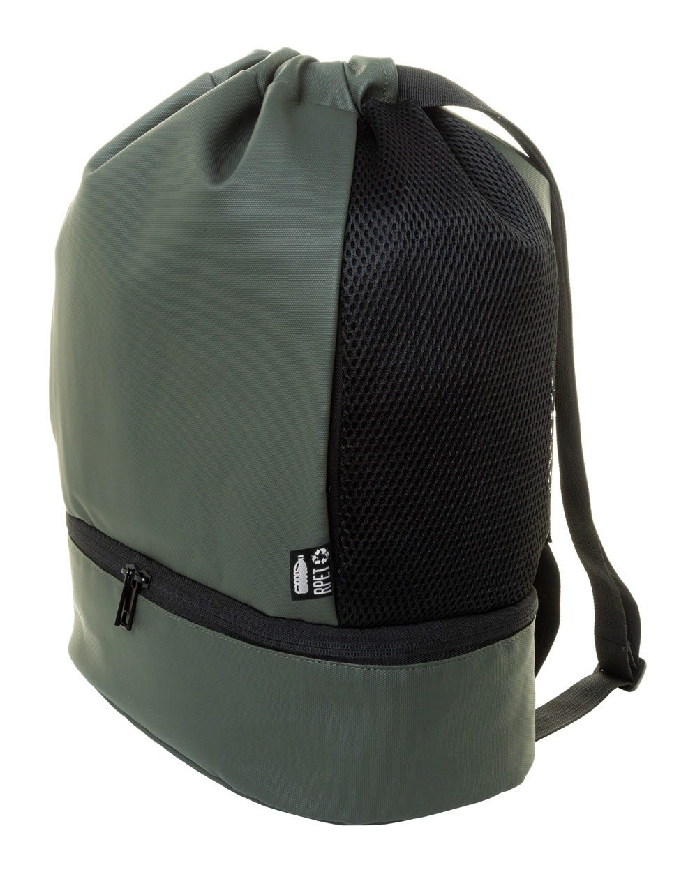 Worek ze ściągaczem RPET z przegrodą na buty zapinaną na suwak, siateczkowymi wstawkami bocznymi i szerokimi paskami. Poliester RPET 600D powlekany poliuretanem z charakterystyczną metką RPET.
