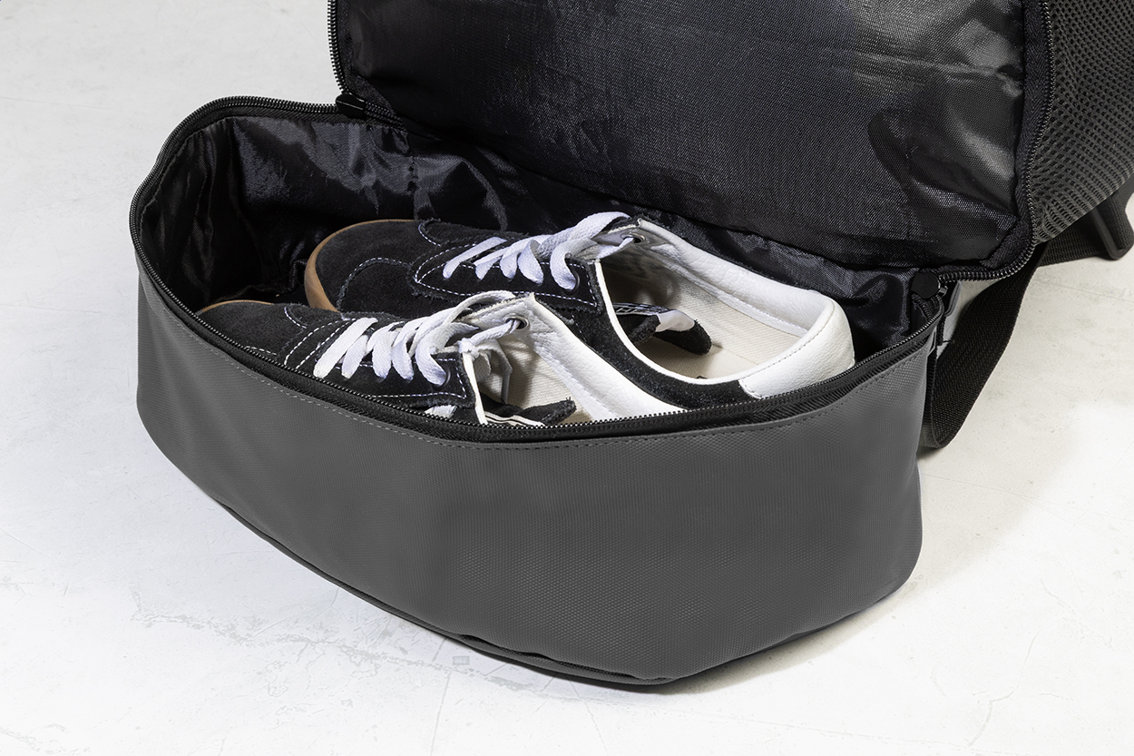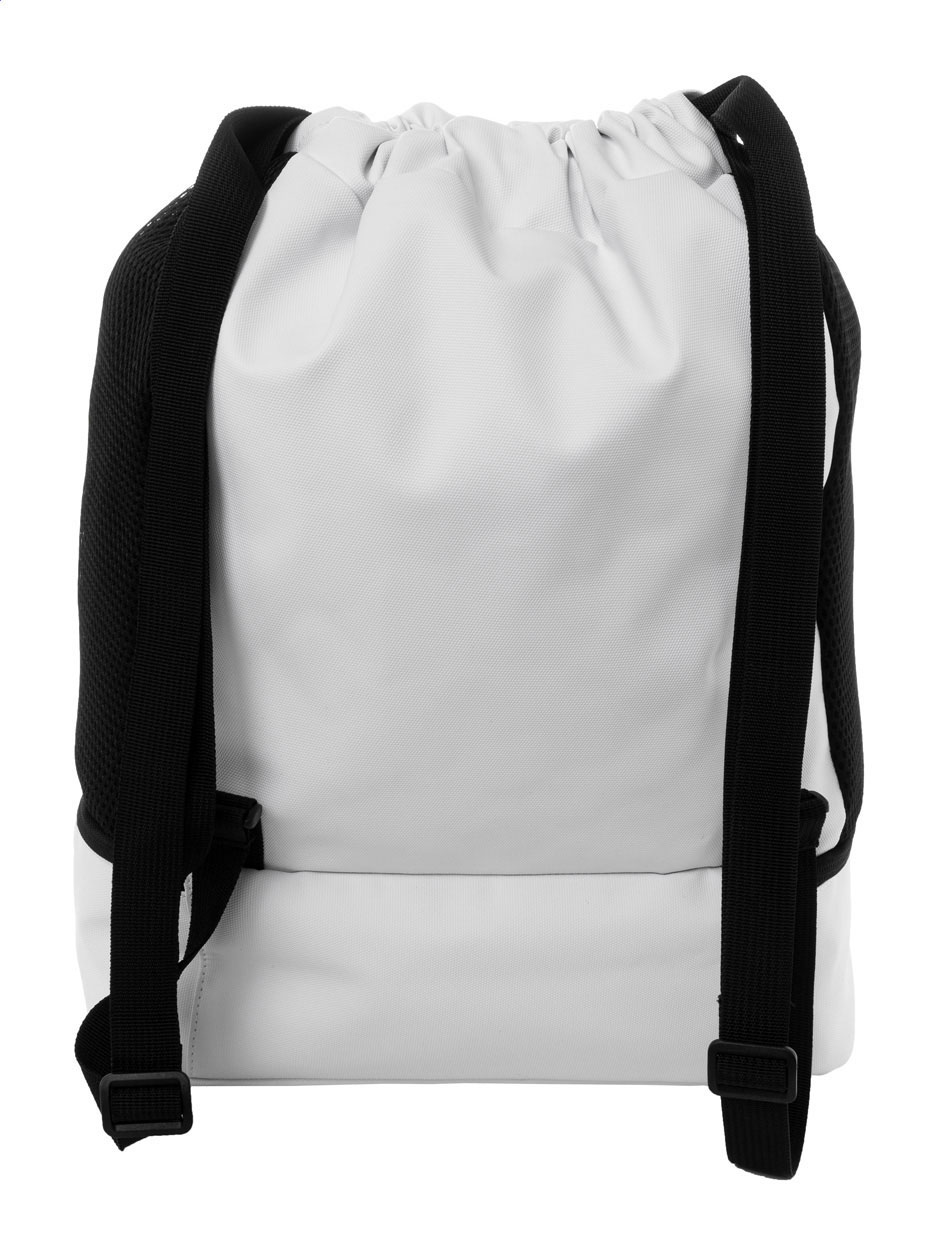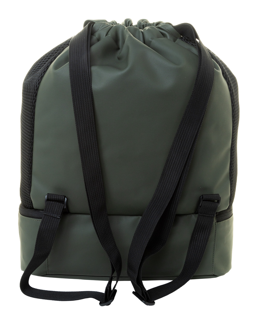 Worek ze ściągaczem RPET z przegrodą na buty zapinaną na suwak, siateczkowymi wstawkami bocznymi i szerokimi paskami. Poliester RPET 600D powlekany poliuretanem z charakterystyczną metką RPET.
