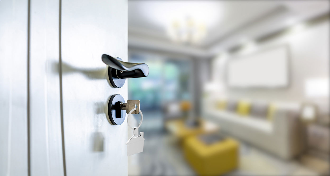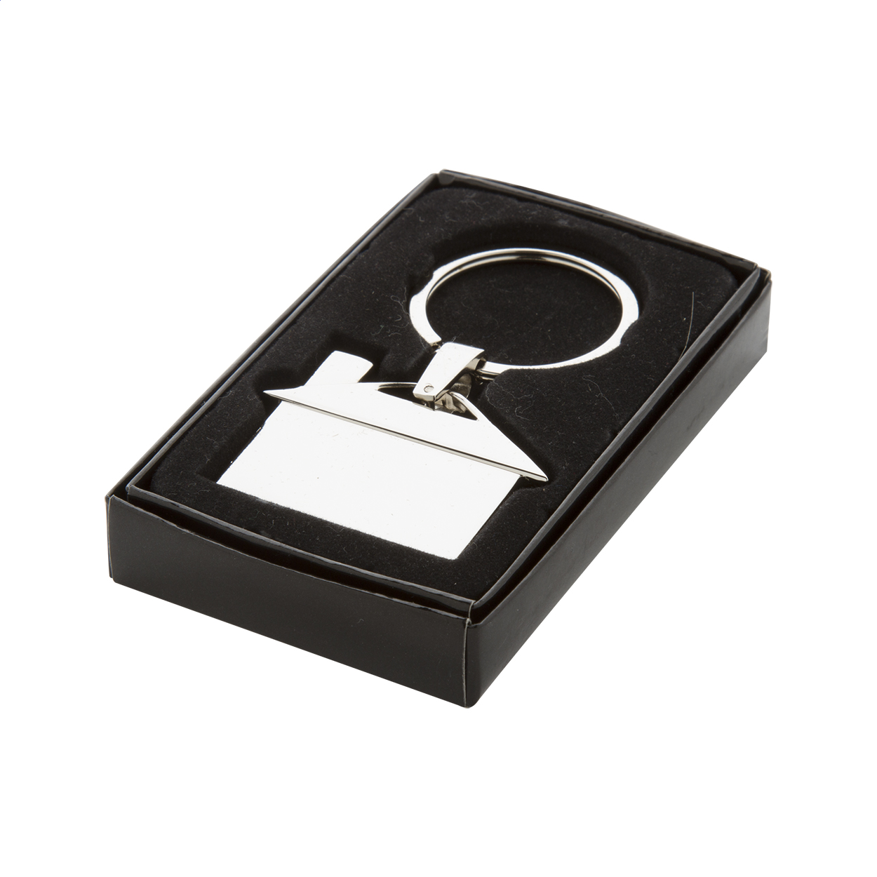 Metalowy brelok w kształcie domu w czarnym kartonowym pudełku.