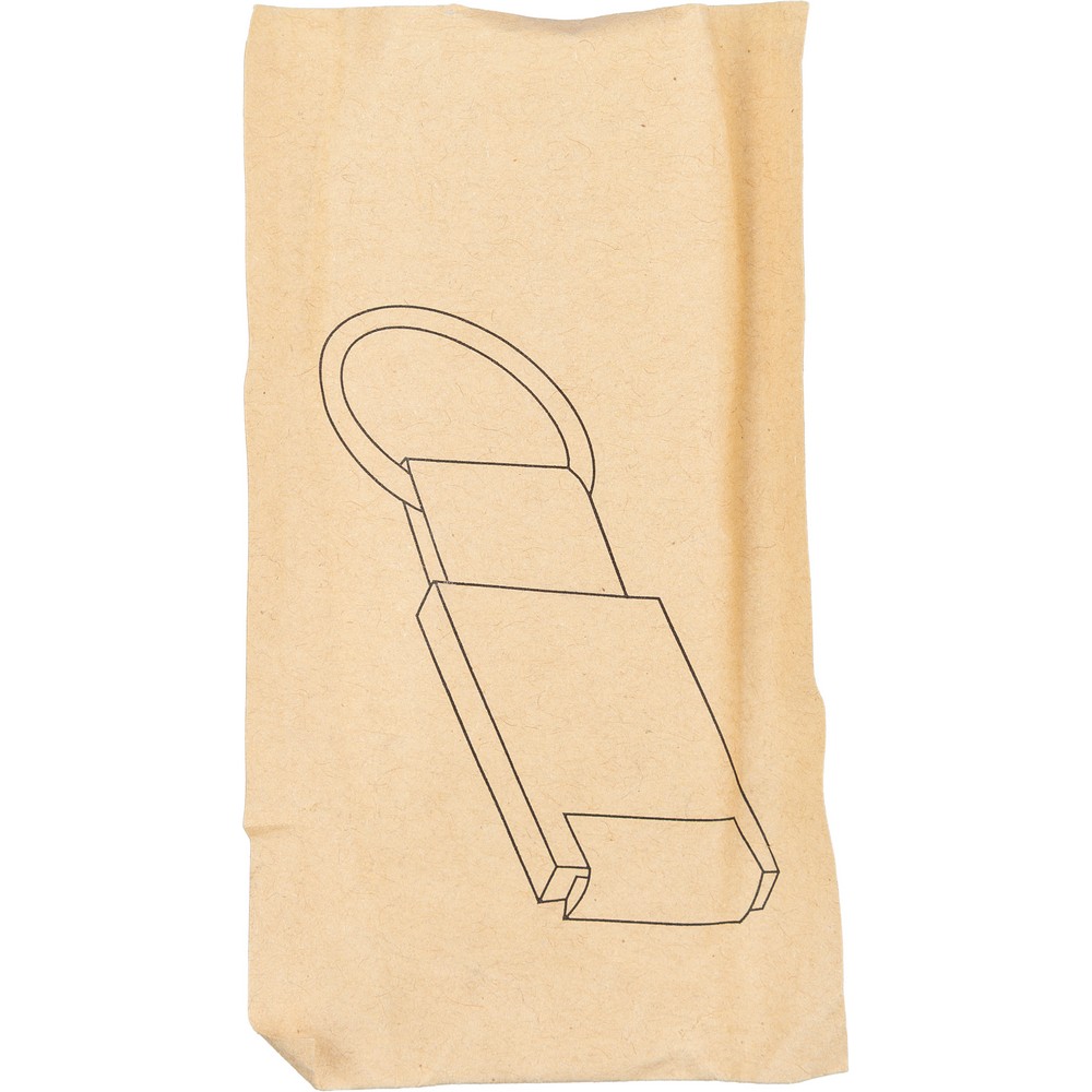 Metalowy brelok do kluczy z dżinsową zawieszką, zapakowany w rękaw papieru kraftowego