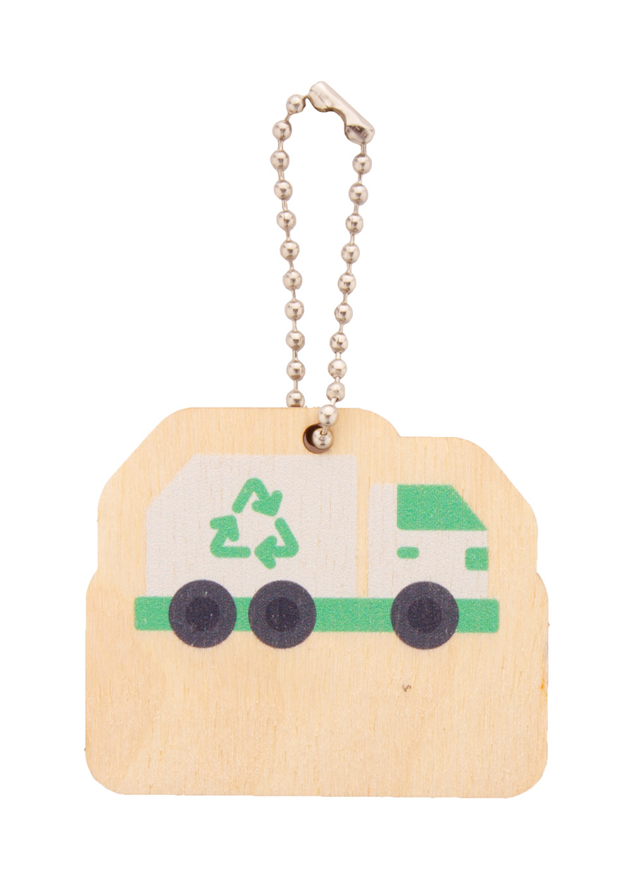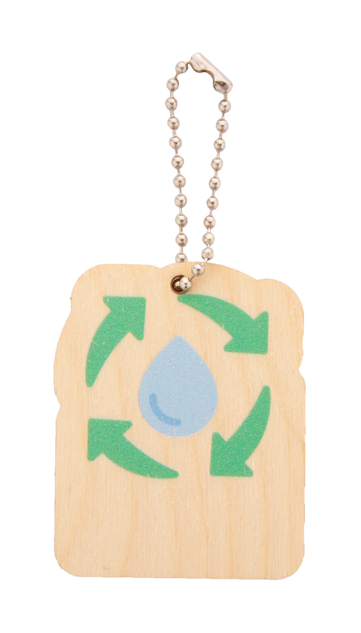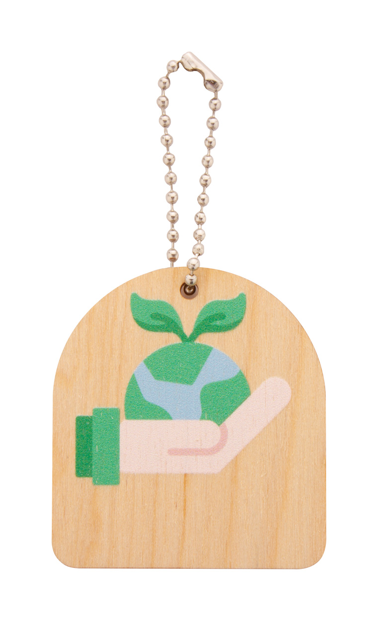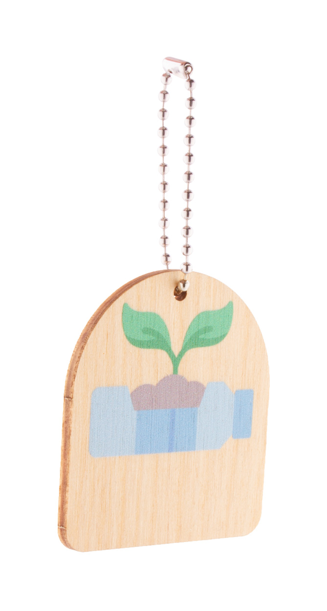 Brelok ze sklejki brzozowej z metalowym łańcuszkiem i motywem związanym z ochroną środowiska.
