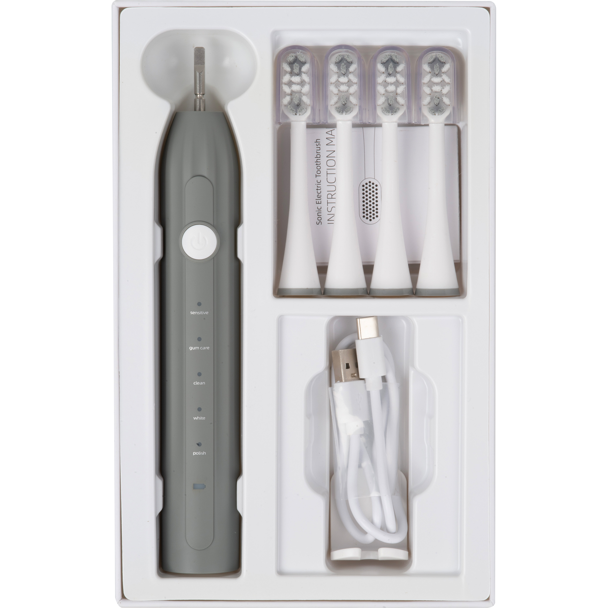 Elektryczna szczoteczka do zębów (200 mAh), z 4 zapasowymi wymiennymi końcówkami, ładowana przez złącze USB-C (kabel dołączony). Dodatkowe końcówki – 75274.