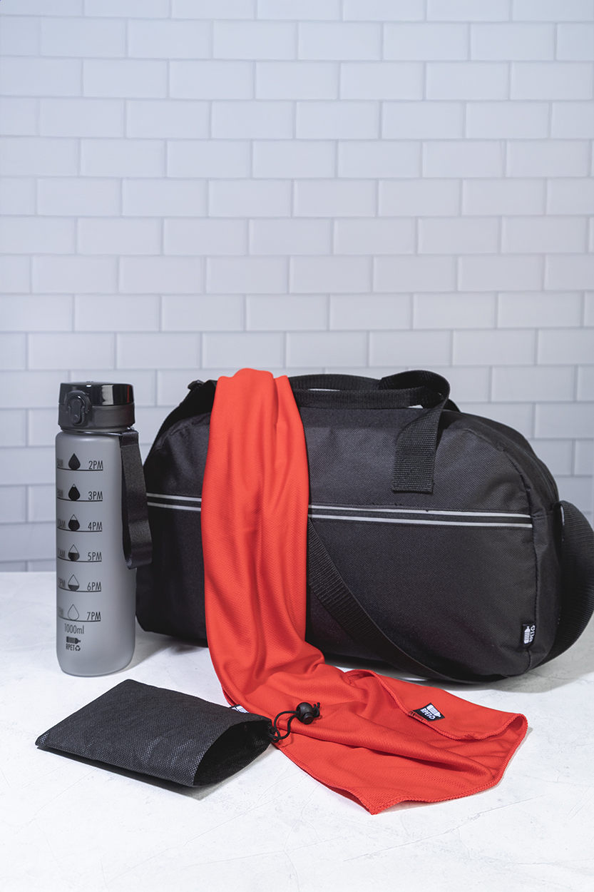 Ręcznik sportowy z mikrofibry RPET w woreczku z włókniny RPET z charakterystyczną mertką RPET. Poliester RPET, 140 g/m².