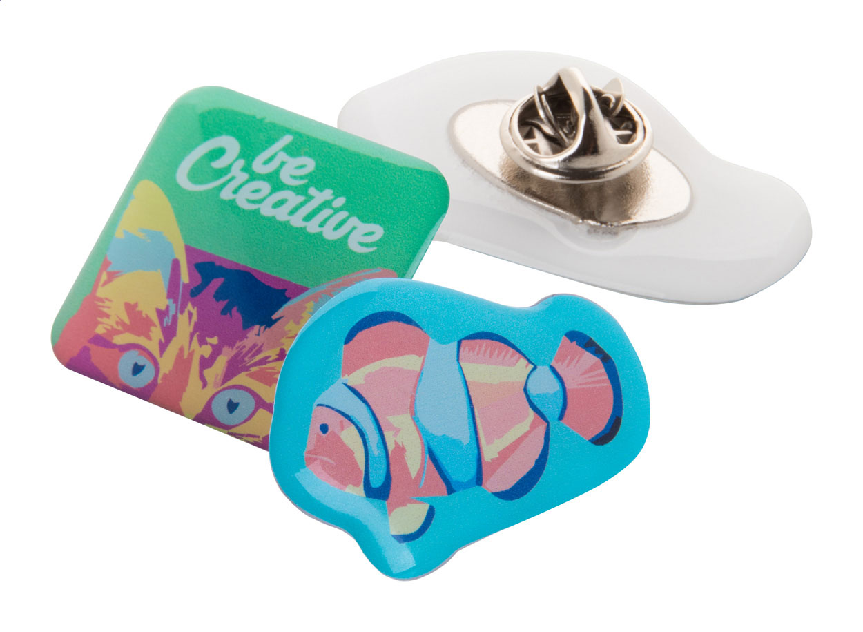 Personalizowana plakietka opoksydowa z metalowym pinem. W personalizowanym kształcie z własną grafiką. Maks. wymiar 9 cm². Min. ilość: 100 szt.