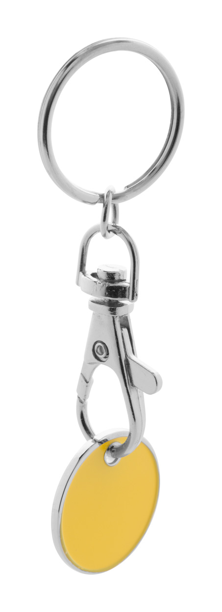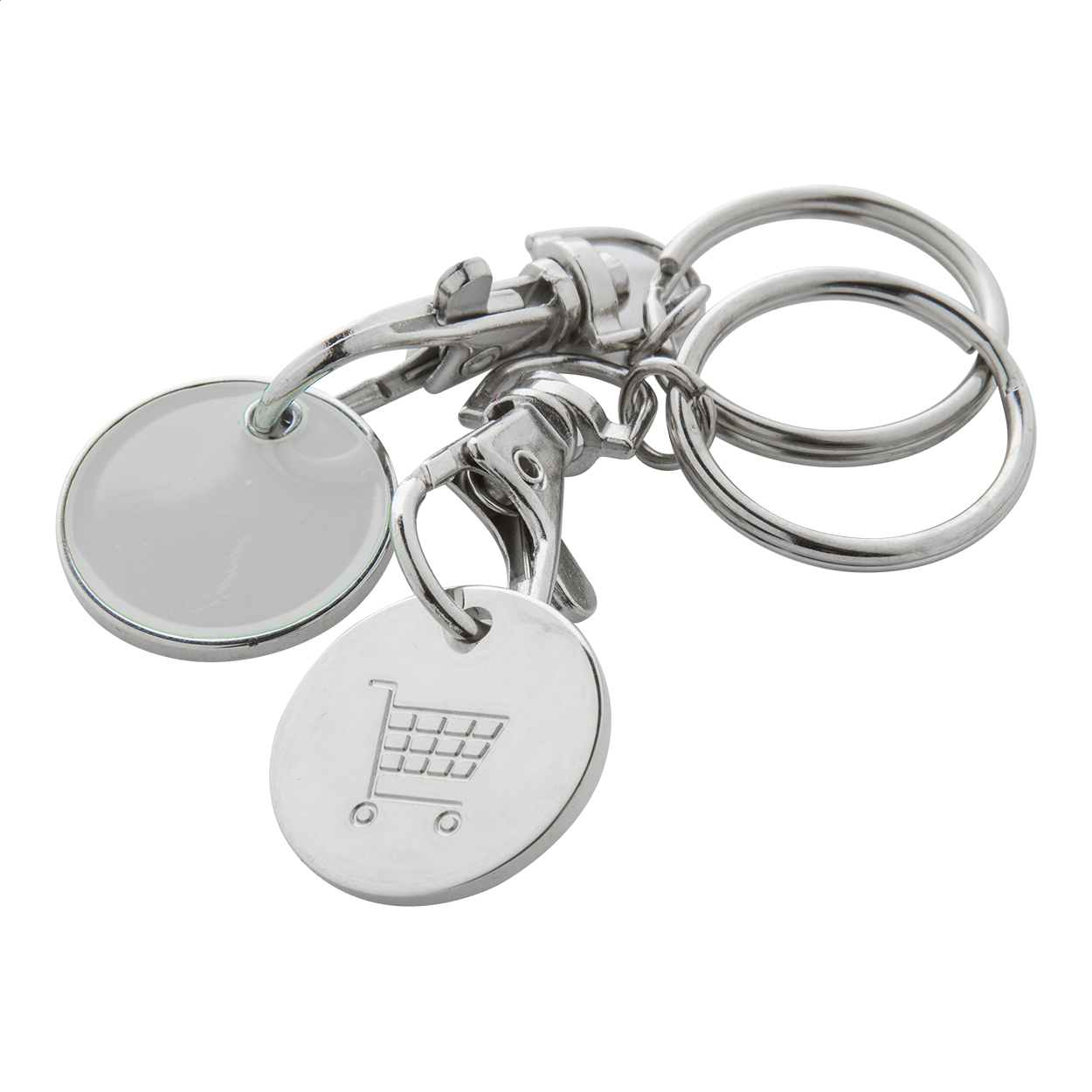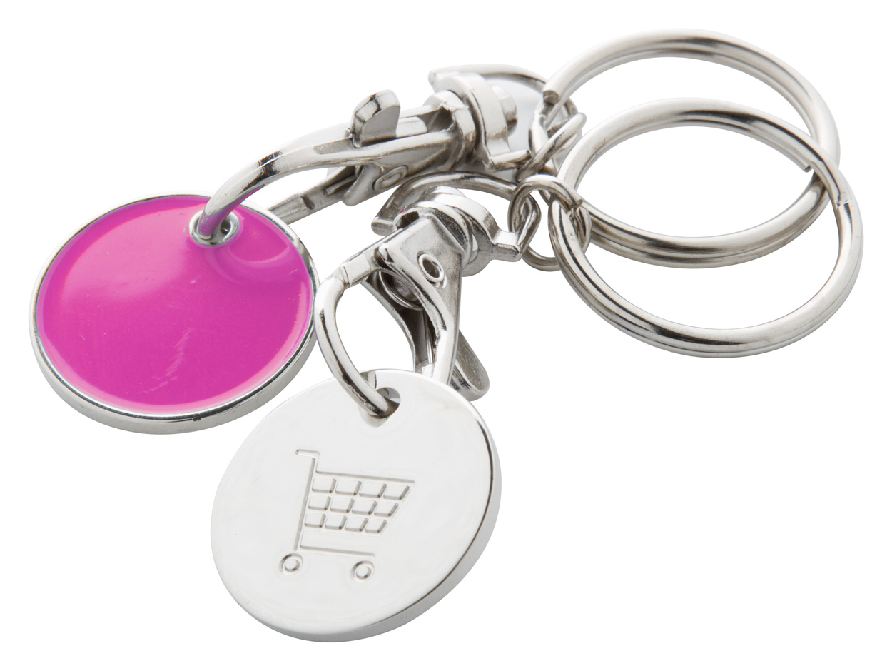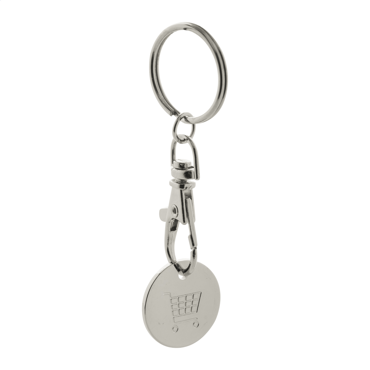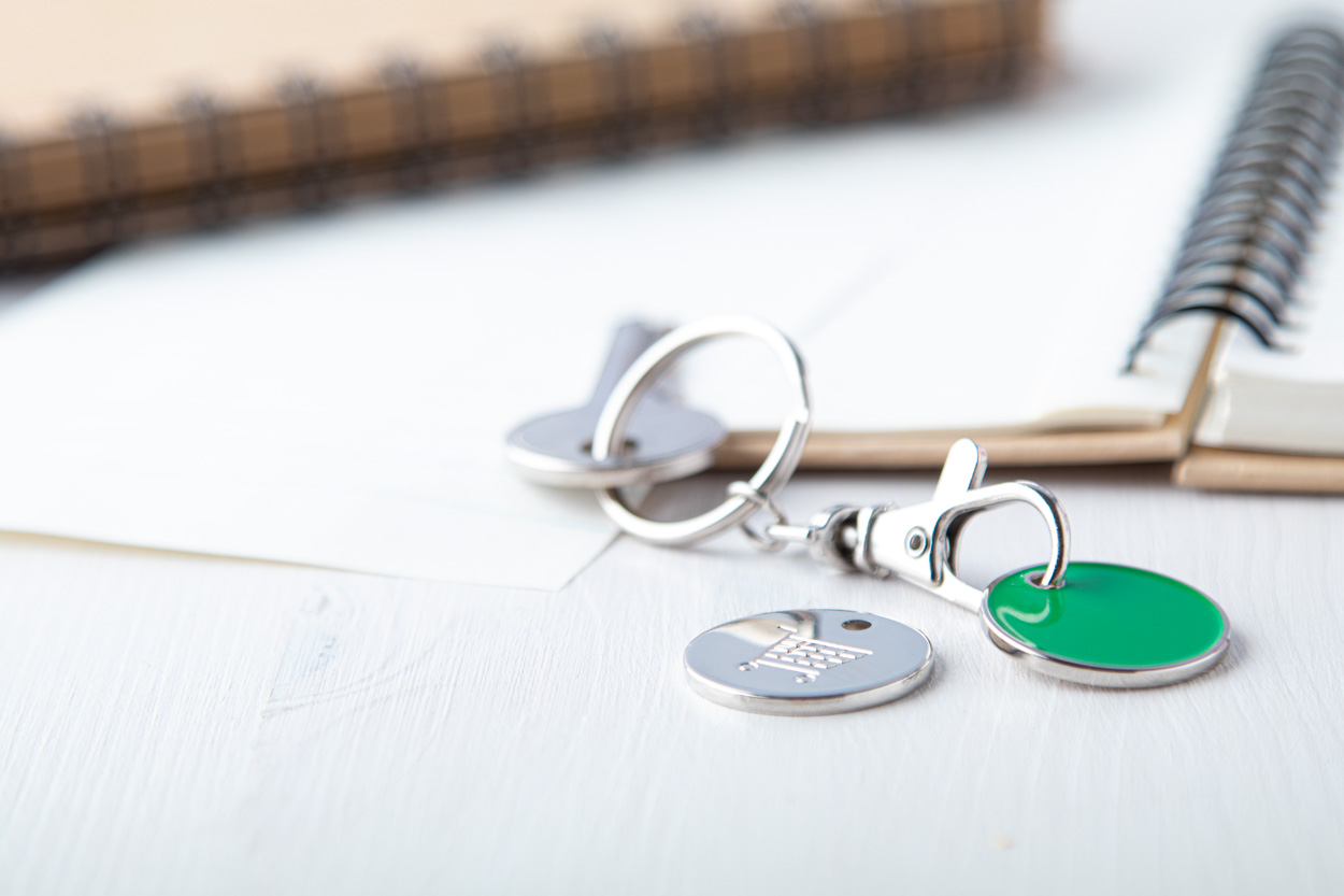 Metalowy brelok z żetonem do wózka na zakupy. Po jednej stronie żetonu wygrawerowany został wózek ma zakupy, druga strona jest pomalowana w kolorze. Wielkość żetonu: ø23×1,7 mm.
