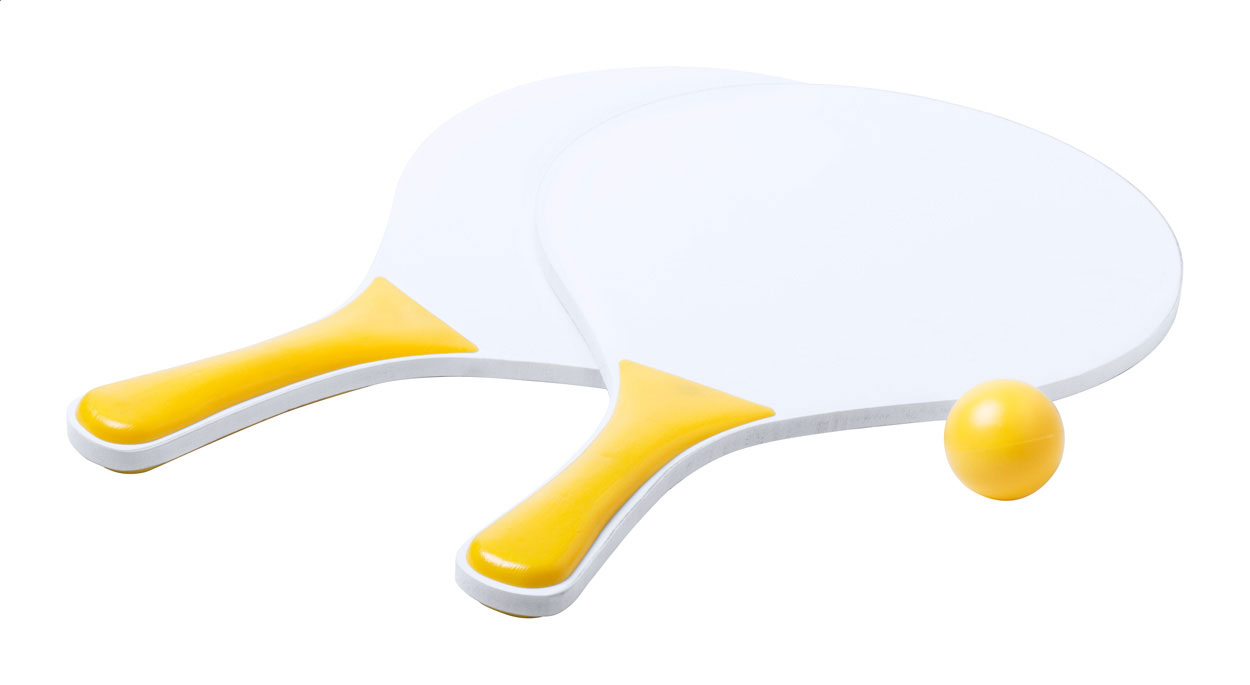 Tenis plażowy z 2 dużymi rakietami i jedną piłką, wykonany z drewna i plastiku.