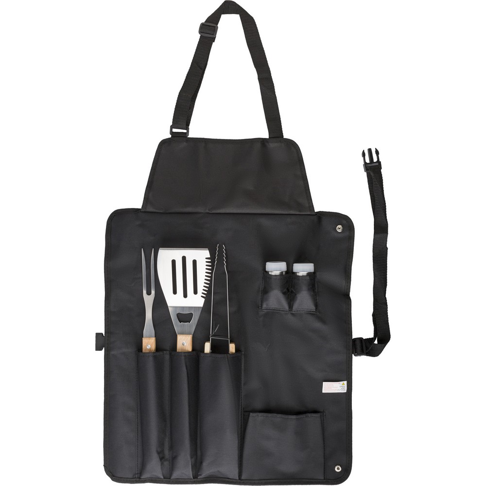 Fartuch z 5-elementowym zestawem do grilla: widelec do mięsa, łopatka, szczypce oraz komplet do soli i pieprzu