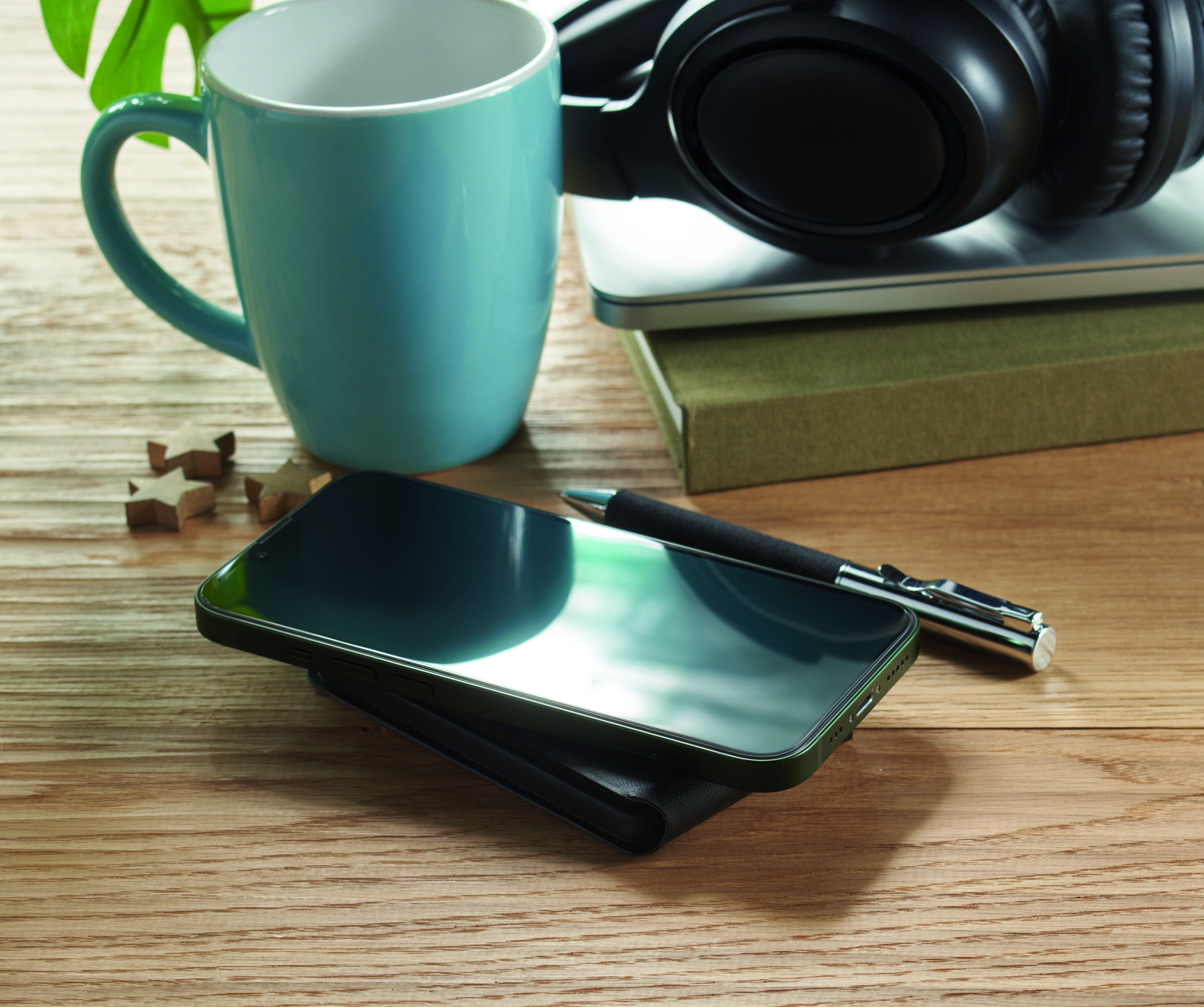 Składana ładowarka bezprzewodowa 15 W z magnetyczną podstawką na telefon z poliestru z recyklingu z poliuretanem.