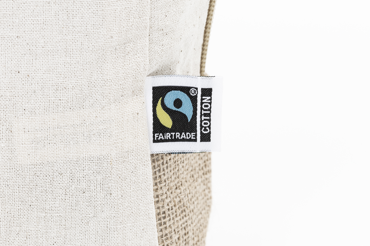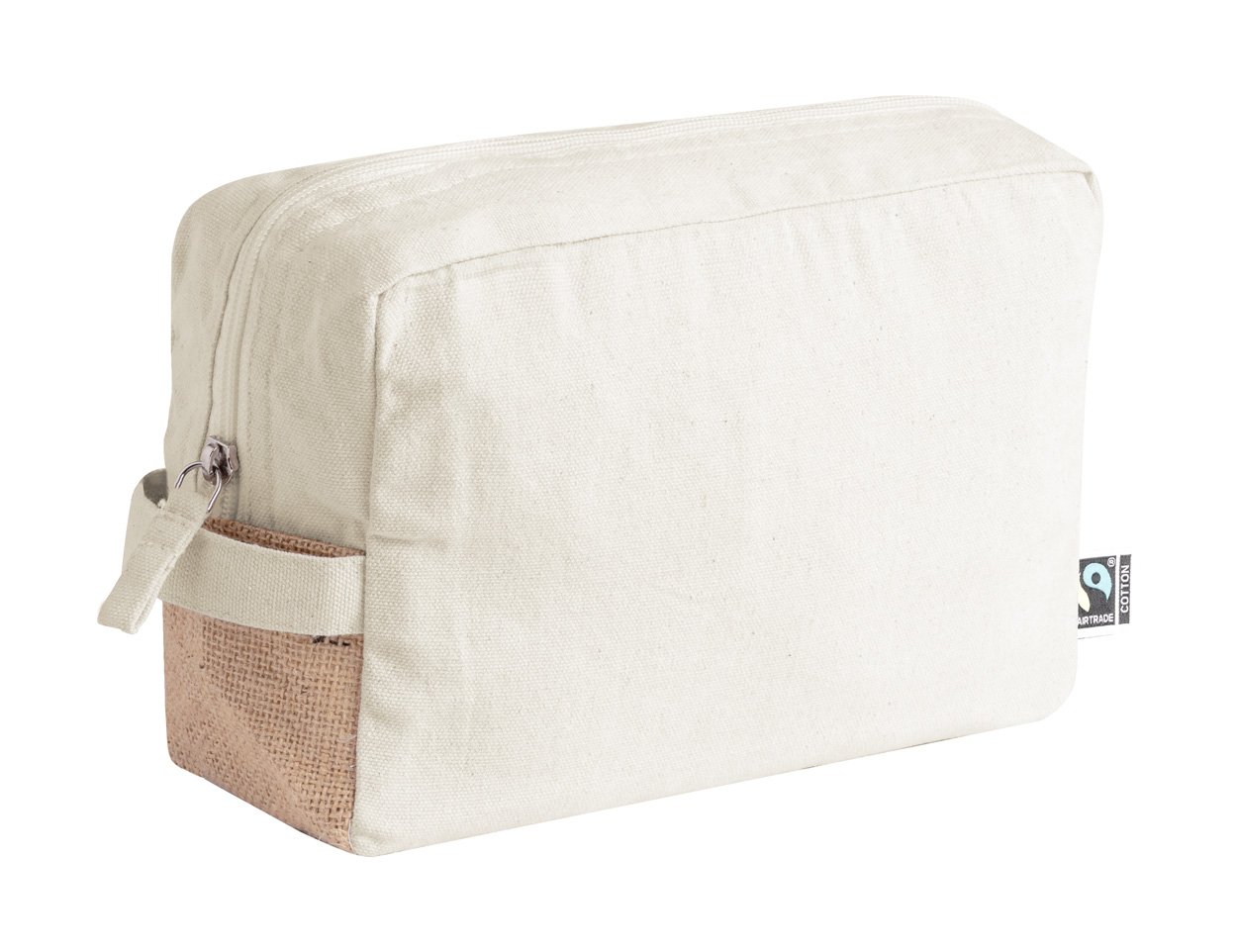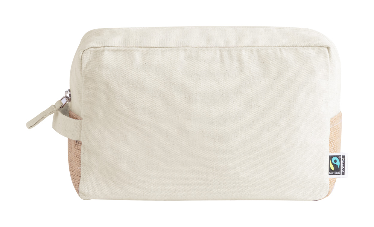 Kosmetyczka zapinana na suwak, wykonana z bawełny Fairtrade i laminowanej juty, z charakterystyczną metką Fairtrade. Wykonana w 100% z bawełny Fairtrade, 180 g/m².