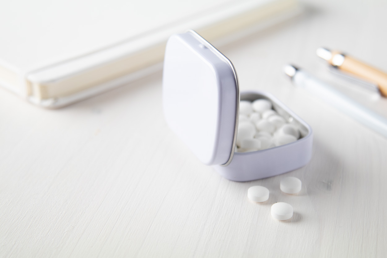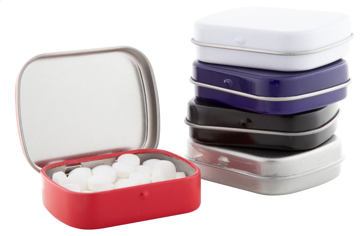 Prostokątne pudełko blaszane o pojemności ok. 25 gramów zawierające cukierki miętowe.