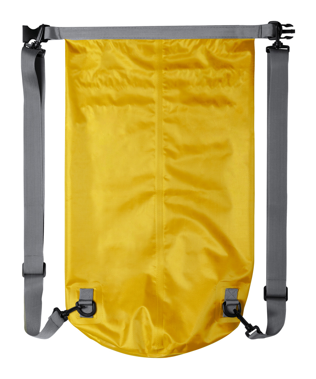 Wodoodporna, sucha torba z materiału ripstop z plastikową klamrą i regulowanymi paskami na ramię.