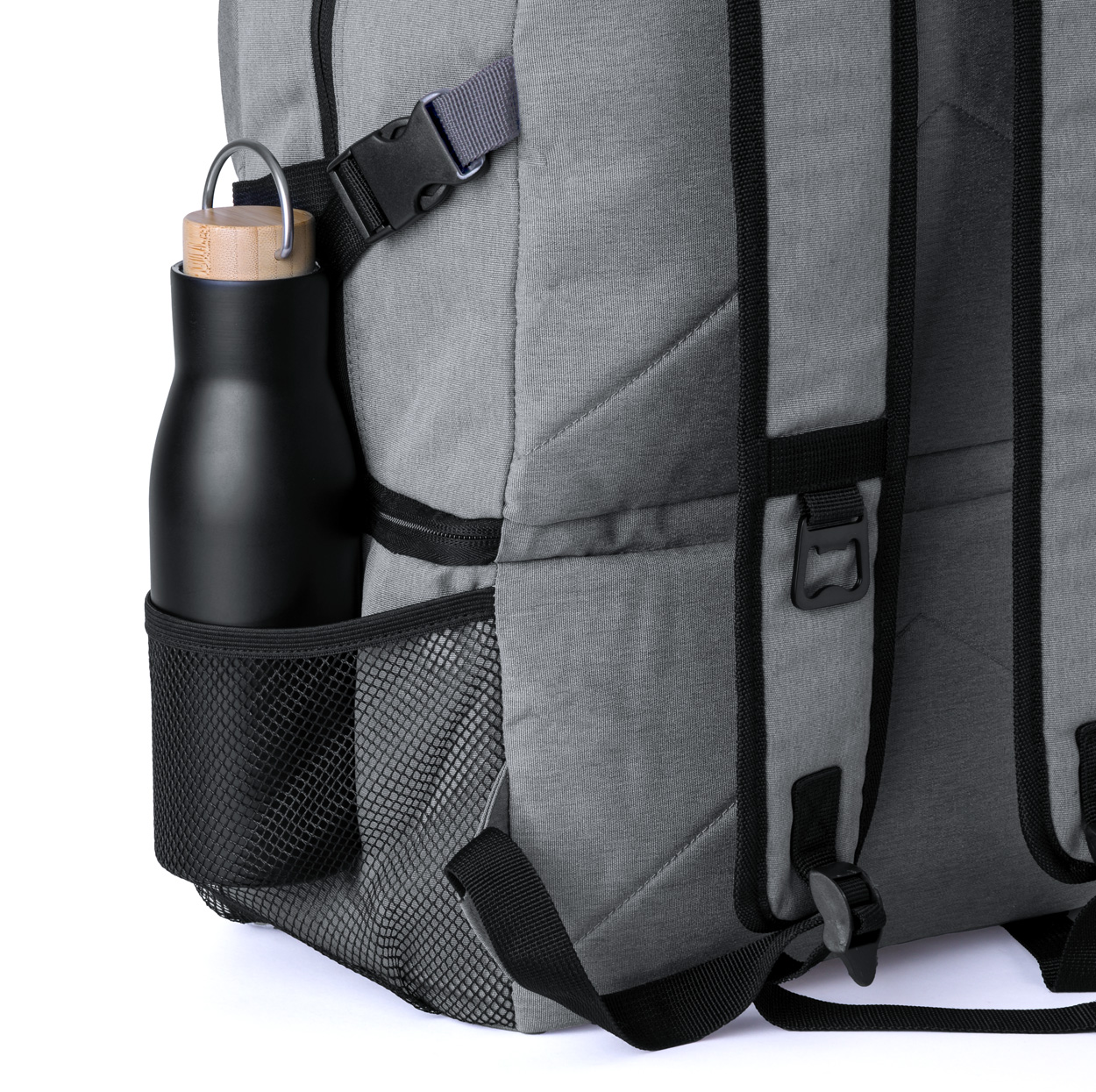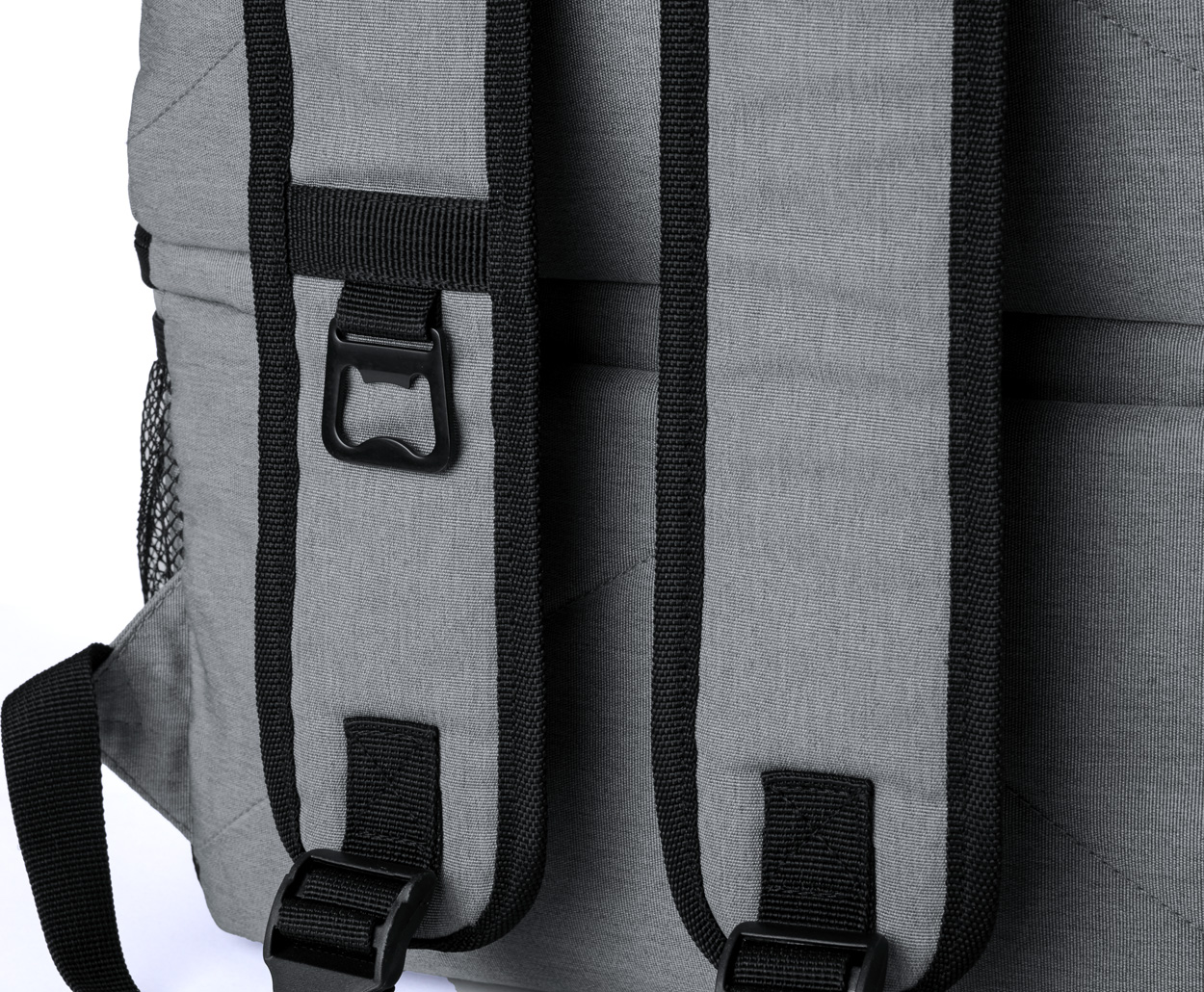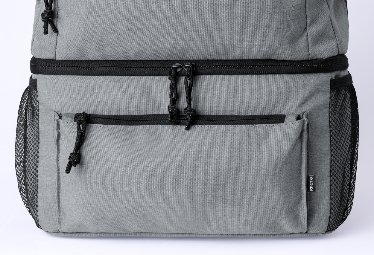 Plecak RPET z wyściełaną komorą termiczną PEVA, kieszeniami zapinanymi na zamek, bocznymi kieszeniami z siateczki, wyściełanymi plecami i szelkami. Poliester 600D RPET, z charakterystyczną metką RPET.