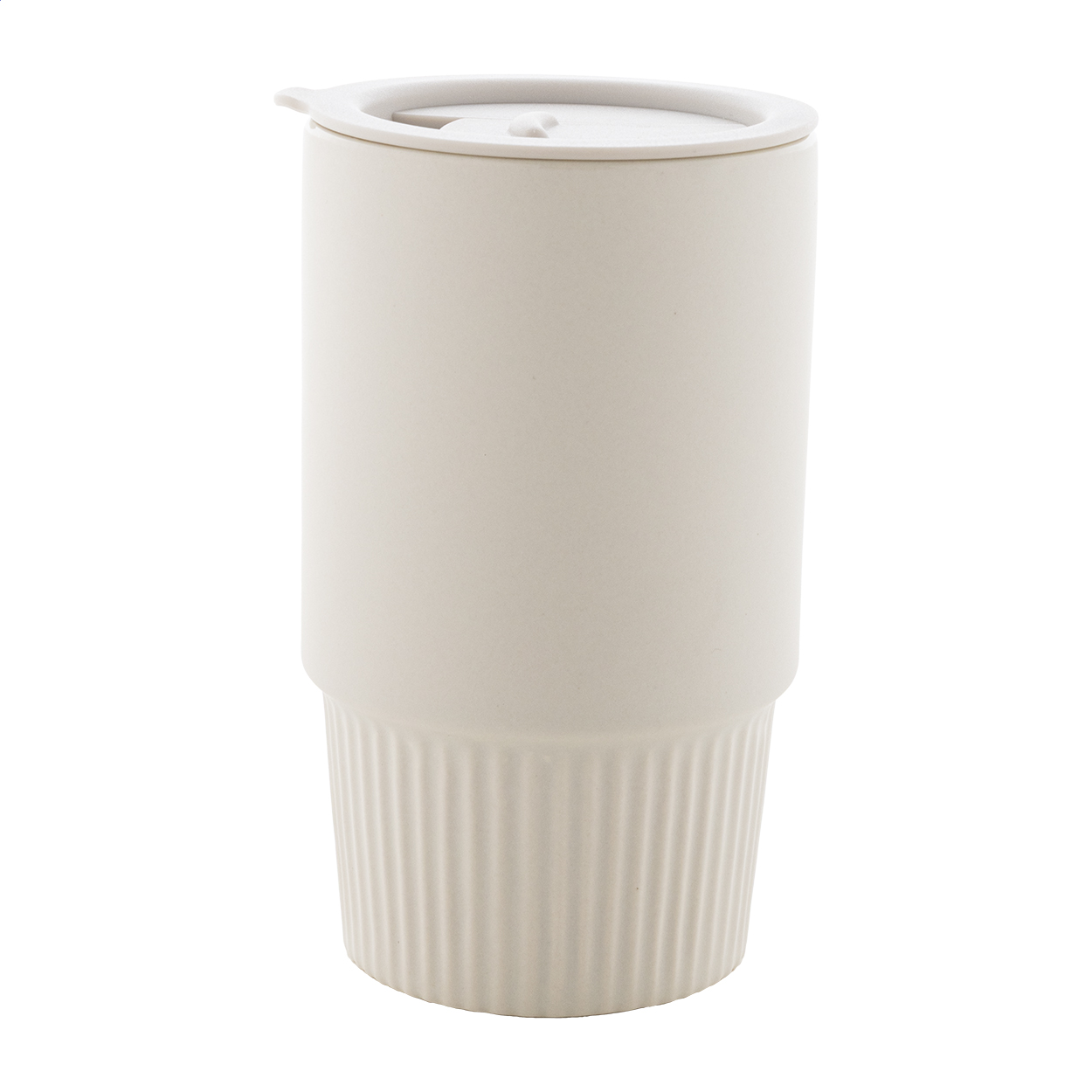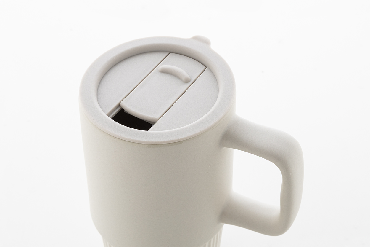 Wysokiej jakości ceramiczny kubek podróżny z matowym wykończeniem zewnętrznym i plastikową pokrywką PP. Pojemność 420 ml.