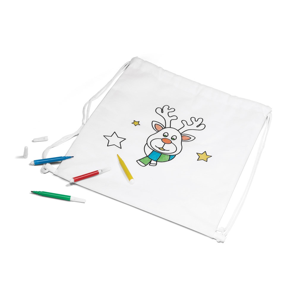 Worek do kolorowania wykonany z tkaniny non-woven (80 g/m²). Z rysunkiem do pokolorowania i wewnętrzną kieszenią oraz dołączonymi 4 markerami