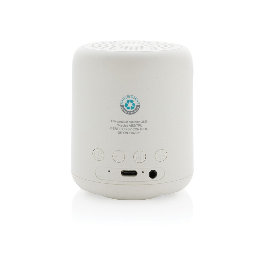 Głośnik bezprzewodowy 5W, BT 5.0, wykonany z ABS i PET pochodzącego z recyklingu z certyfikatem RCS (Recycled Claim Standard), całkowita zawartość materiałów z recyklingu obliczona na podstawie wagi całkowitej przedmiotu: 38%, akumulator o pojemności 300 mAh umożliwia odtwarzanie muzyki do 5 godzin, zasięg do 10m, wbudowany mikrofon, funkcja odbierania połączeń, w pudełku kraftowym z certyfikatem FSC® mix, kabel wykonany z TPE z recyklingu w komplecie, nie zawiera PVC, ślad węglowy produktu: 3,75 kg CO2