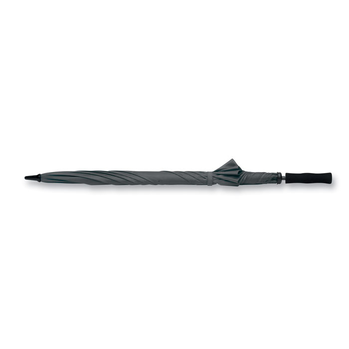 Parasol 30 cali, otwierany ręcznie, odporny na wiatr. Trzon i żebra z włókna szklanego, czarne plastikowe końcówki i szpic. Materiał: poliester 190T. Czarna, prosta rączka z EVA. Zamykany manualnie.