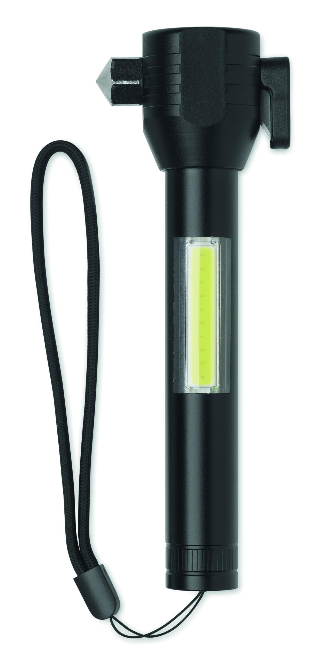 Aluminiowa latarka 3 w 1 z młotkiem awaryjnym i przecinakiem do pasów bezpieczeństwa. Posiada światło COB z boku i z przodu. W zestawie magnes i pasek na rękę. Wbudowany akumulator 500 mAh w zestawie.