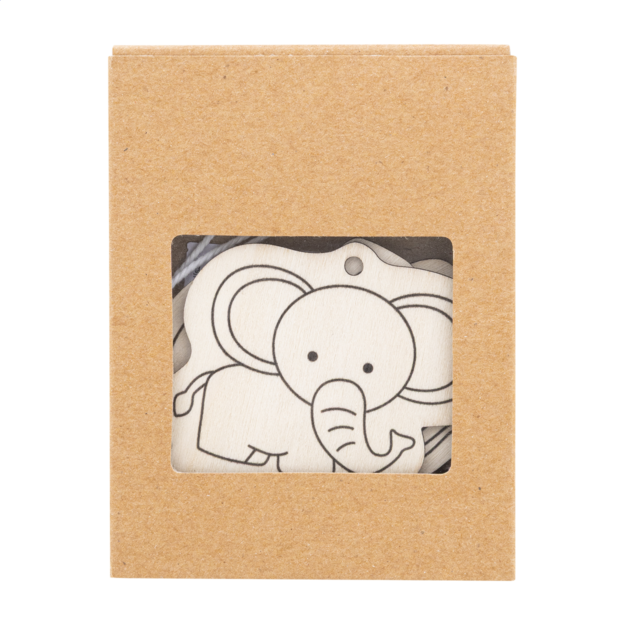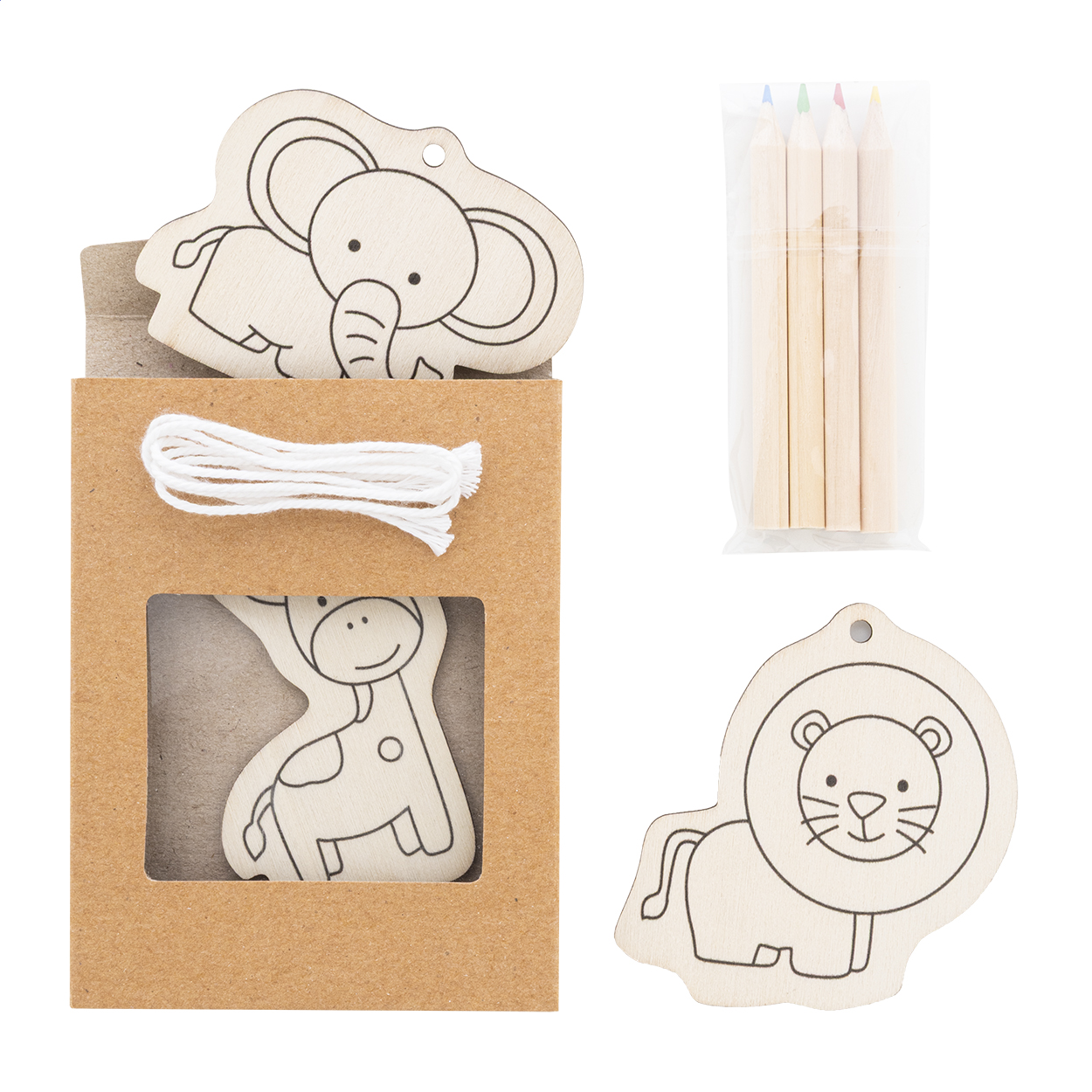 Zestaw do kolorowania, 3 drewniane figurki zwierząt, w tym 4 drewniane kredki i sznurki do zawieszania. W pudełku z papieru kraft.