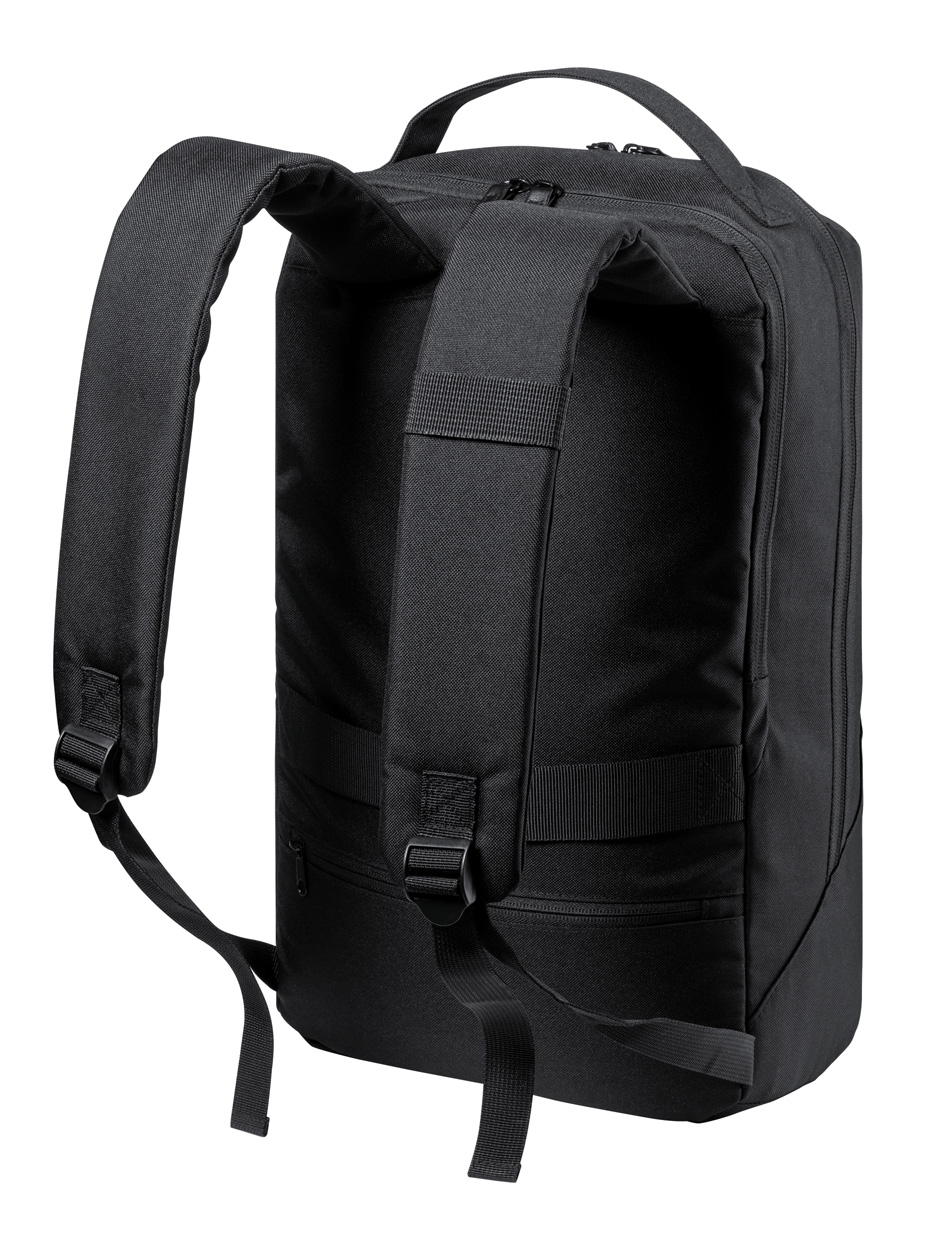 Wodoodporny plecak RPET z przegrodami zapinanymi na zamek, wyściełaną przegrodą na laptopa (15″) i tablet (10″), paskiem do walizki, ukrytą kieszenią antykradzieżową i ergonomicznymi paskami na ramiona. Poliester 600D RPET z charakterystyczną metką RPET.