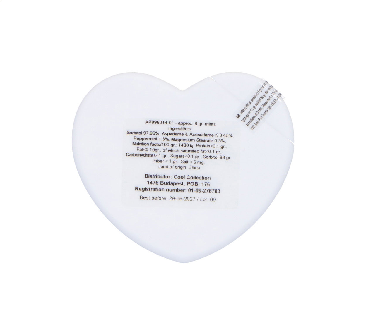 Plastikowy dozownik cukierków miętowych w kształcie serca, zawierający ok. 8 gramów cukierków miętowych bez cukru.