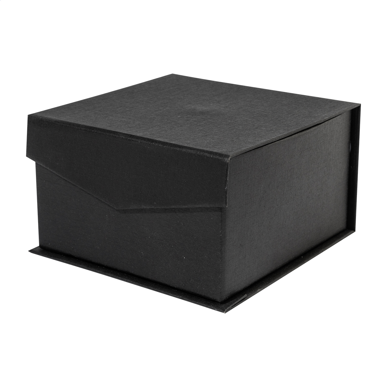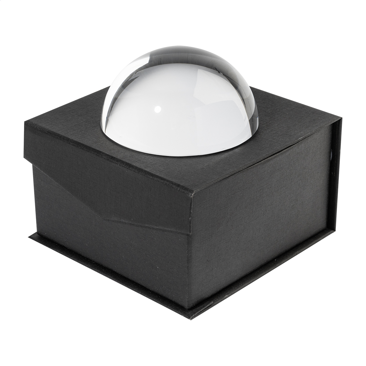 Szklany przycisk do papieru i lupa. W czarnym papierowym pudełku prezentowym z aksamitną wkładką i magnetycznym zamknięciem.