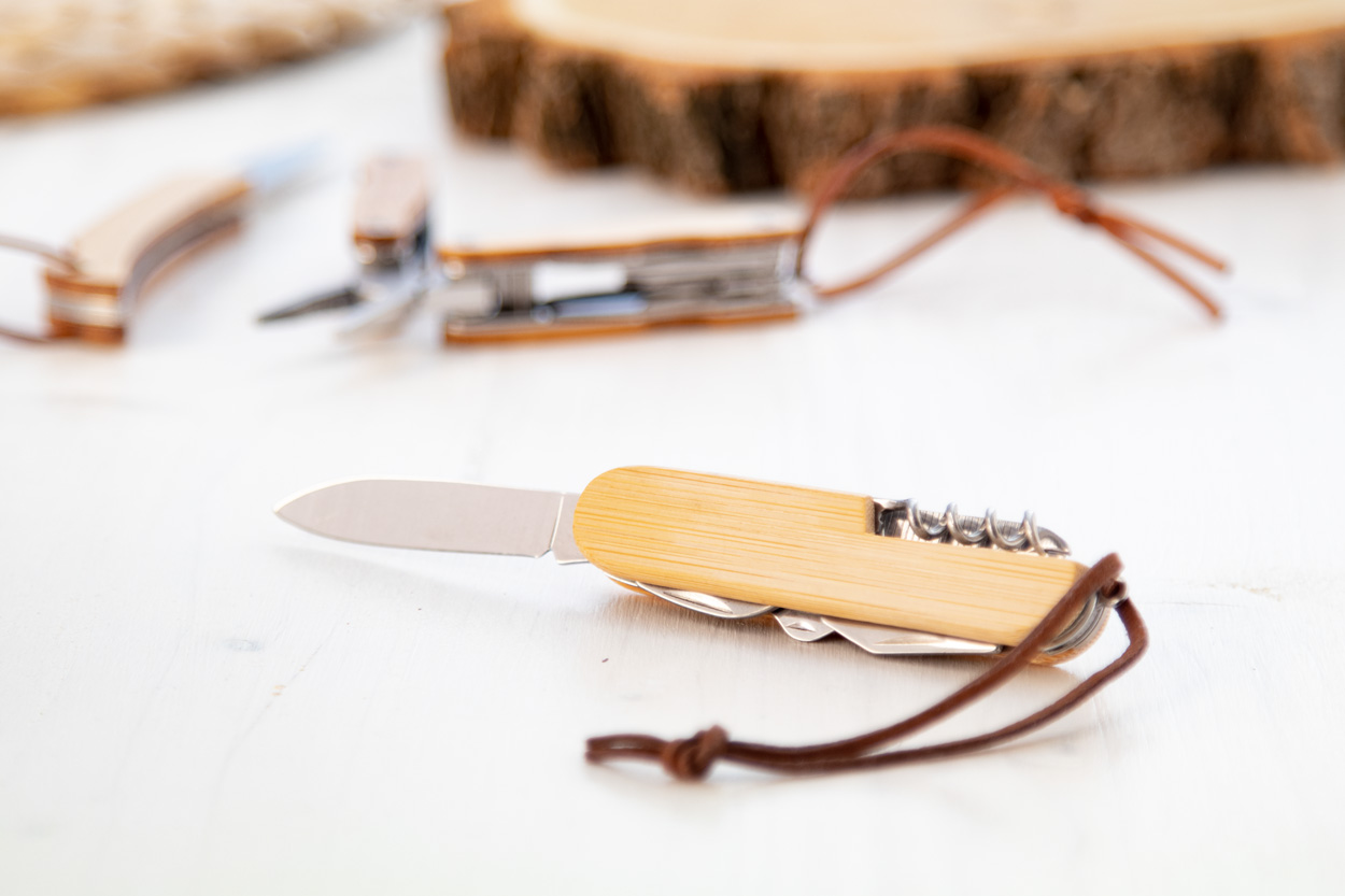 Scyzoryk ze stali nierdzewnej z bambusową rękojeścią i 9 funkcjami. Z paskiem do noszenia ze skóry PU.