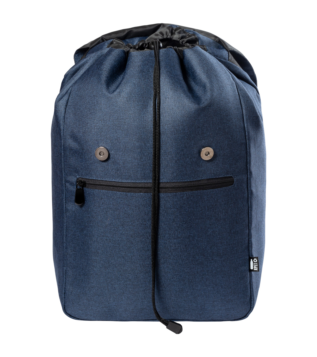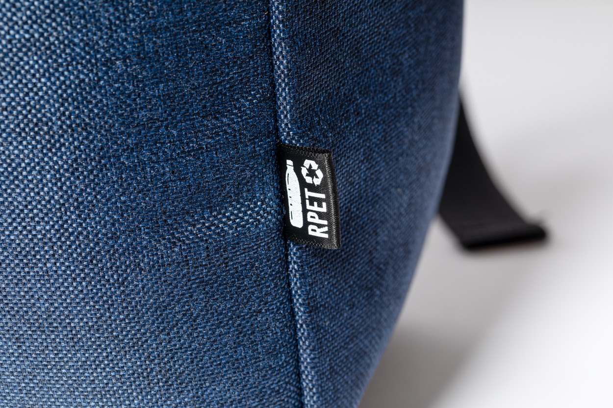 Plecak RPET z wyściełaną przegrodą na laptopa (15″) i tablet (12″), zapinaną przednią kieszenią, wyściełanymi plecami i szelkami. Komora główna ze sznurkiem i zapięciem na zatrzask magnetyczny. Poliester 300D RPET. Z charakterystyczną metką RPET.
