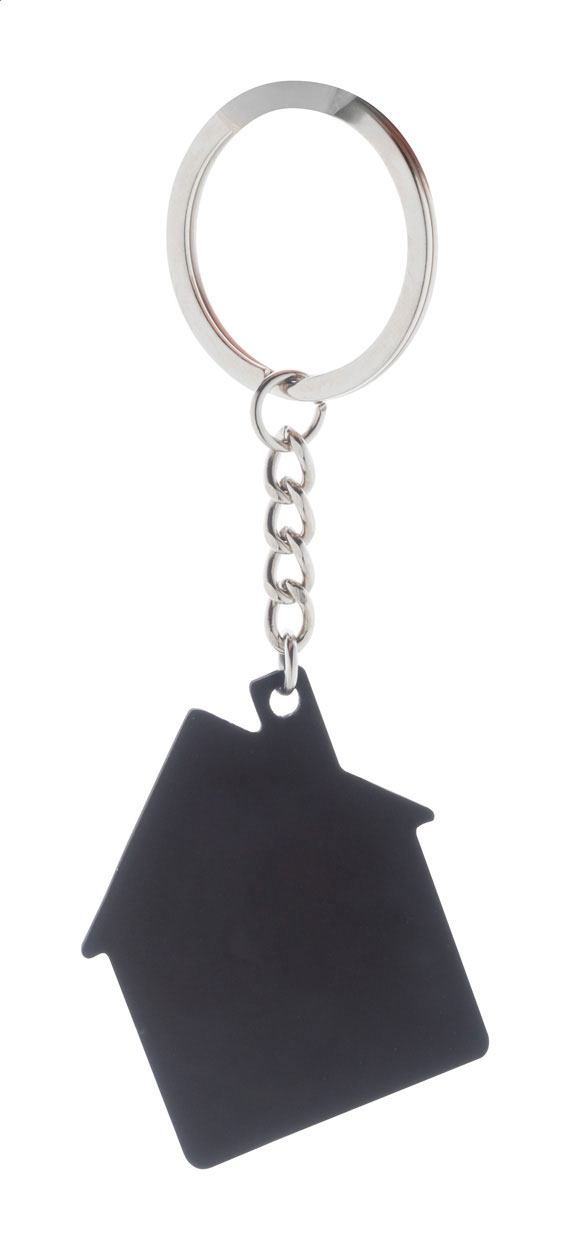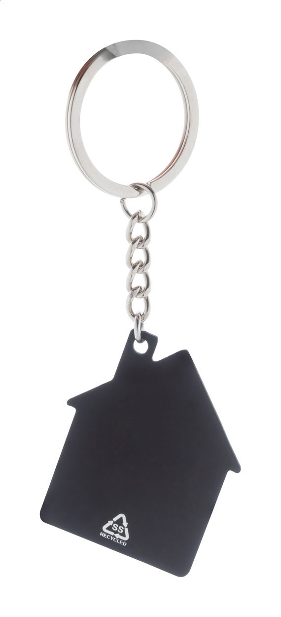 Brelok w kształcie domu, ze stali nierdzewnej z recyklingu z gumowanym wykończeniem. Ze specjalną powłoką do grawera lustrzanego.
