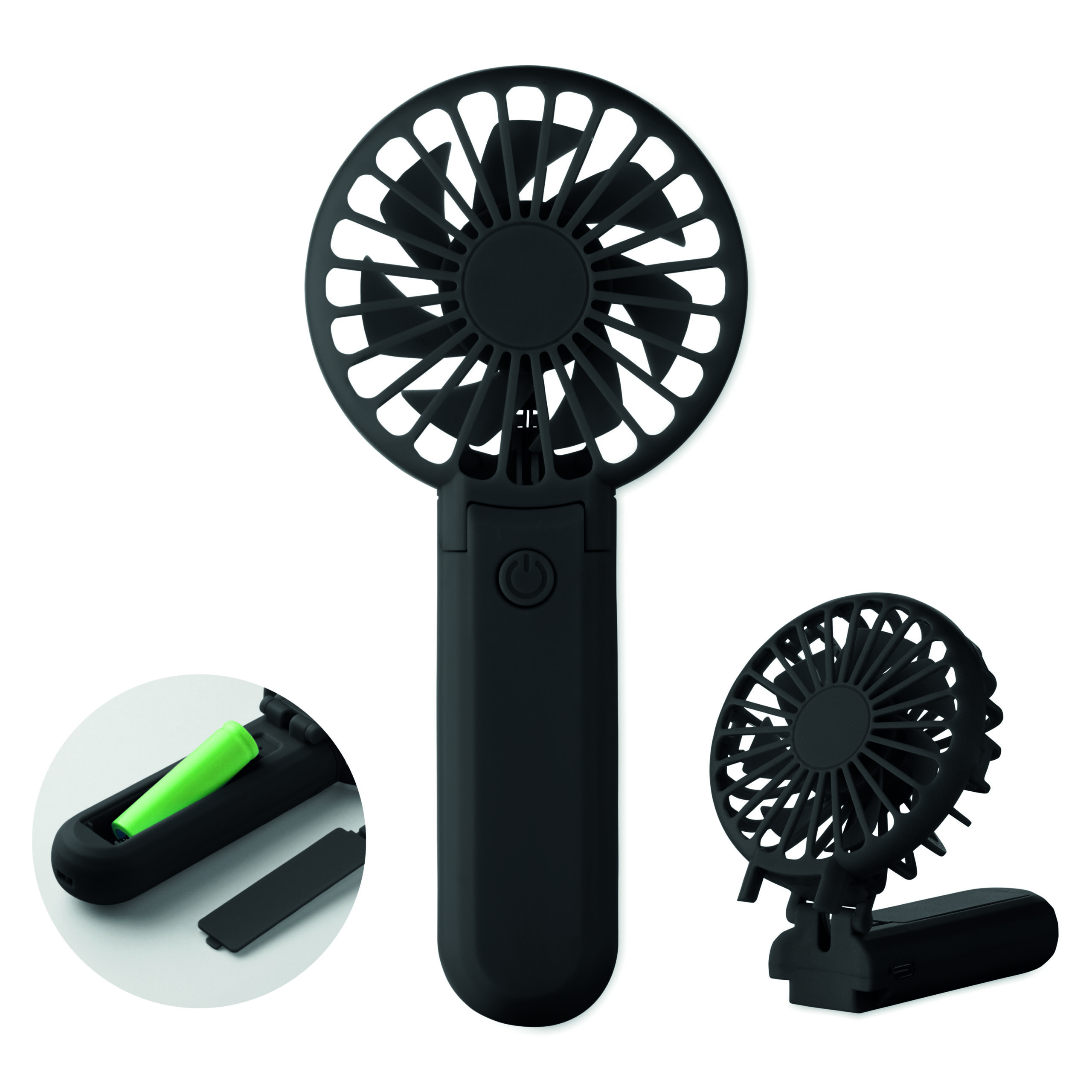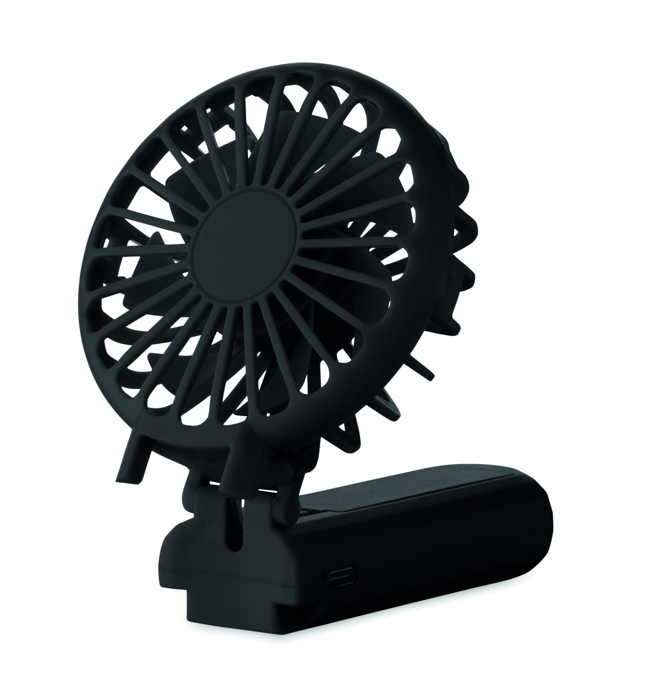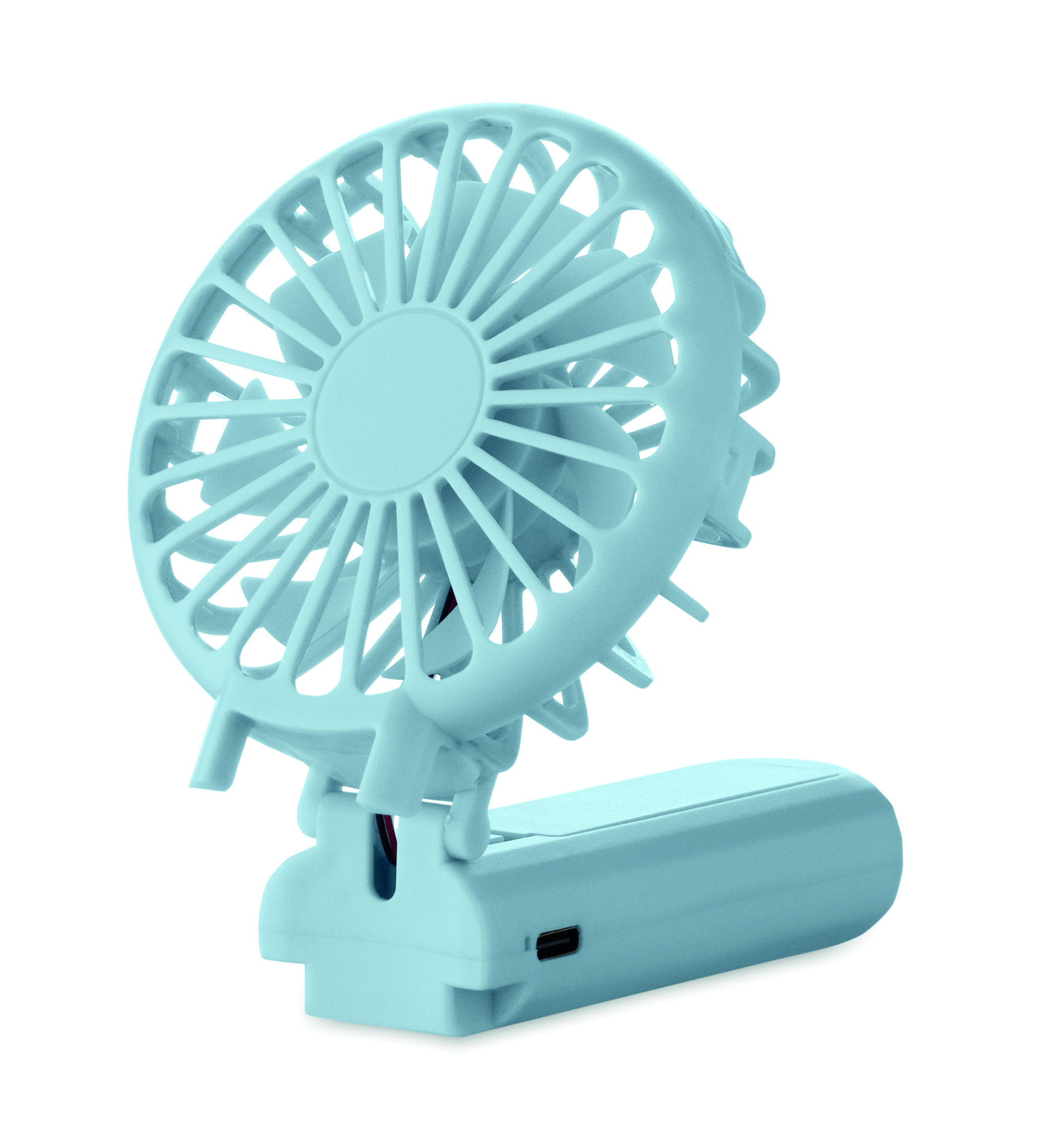 Przenośny, składany wentylator z ABS z 3 ustawieniami prędkości. Może być używany jako wentylator ręczny lub biurkowy. Zawiera 1 wymienną baterię litową 14500 o pojemności 500 mAh.