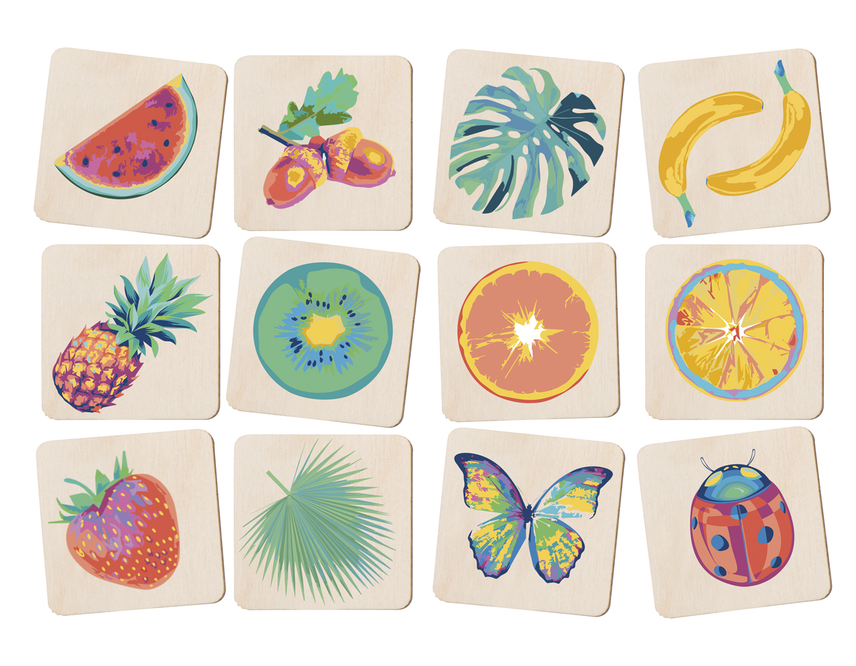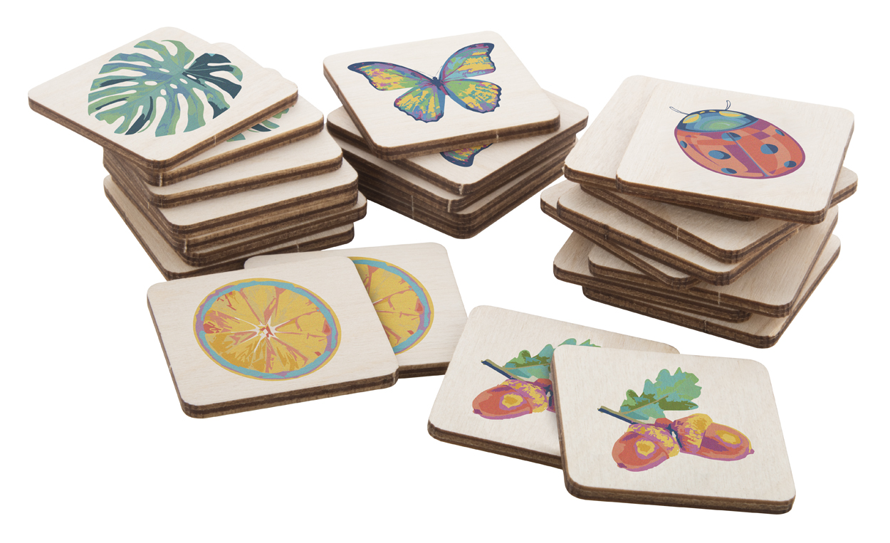 Laminowana gra memory ze sklejki brzozowej z własną grafiką. Z 24 płytkami (40×40 mm). Cena obejmuje 12 różnych nadruków w full kolorze na przedniej stronie płytek i identyczny nadruk w full kolorze na tylnej stronie wszystkich płytek. Min. ilość: 250 szt.